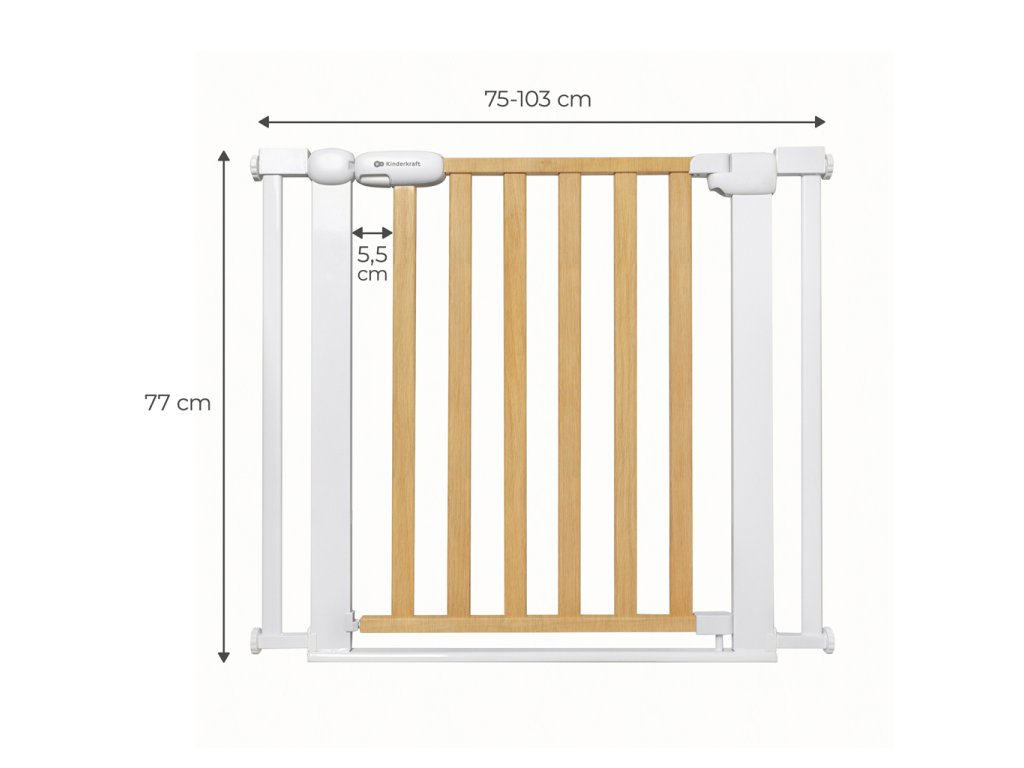 Zábrana má univerzálny dizajn a okrem toho ju môžete nastaviť na šírku od 75 do 103 cm. Hodí sa do akýchkoľvek dverí a môžete ju tiež namontovať vedľa schodov v hornej alebo dolnej časti schodiska, aby po nich vaše dieťatko nemohlo chodiť samostatne.