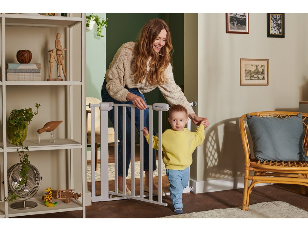 Detská zábrana LOCK & GO má dvojié zabezpečenie. Mechanizmus tiež umožňuje otváranie zábrany jednou rukou. To je obrovské pohodlie, keď prenášate svoje dieťa a chcete sa presunúť z izby do izby, napríklad vymeniť mu plienku.