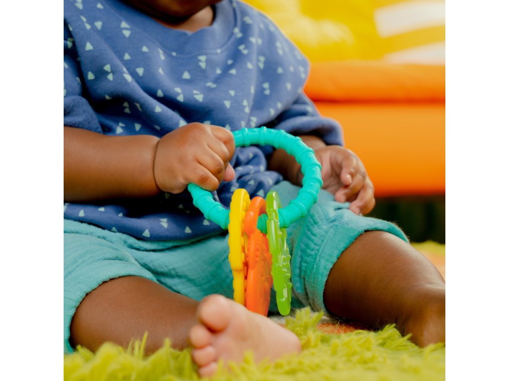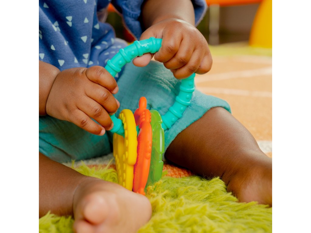 Vaše dieťa si tento krúžok na prerezávanie zúbkov zamiluje. Rozlúčte sa s celodenným rozčuľovaním s týmto krúžkom 4 v 1, ktorý je navrhnutý tak, aby pomáhal upokojiť boľavé ďasná a stimuloval dieťa pri prerezávaní zúbkov. Dieťatko si zamiluje pestré farby . Veľkosť je prispôsobená malým rúčkam. Každý malý hrebeň a hrbolček pomôže masírovať boľavé ďasná dieťaťa. Vlastnosti - balenie 4v1 s farebnými pomocníkmi na prerezávanie zúbkov s rôznymi textúrami: opička, list, banán a silikónový krúžok, - pestré farby a rôznorodá textúra, - ľahko uchopiteľná (vďaka silikónovému krúžku) - neobsahuje BPA Údržba - čistite vlhkou handričkou a jemným mydlom, osušte na vzduchu - nie je možné umývať v umývačke riadu