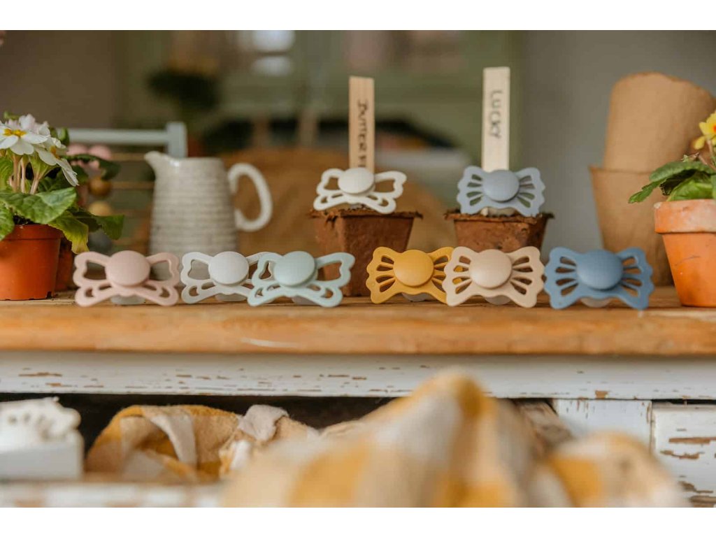 Tvar cumlíka FRIGG Butterfly pripomína motýľa. Štít so zvlnenými okrajmi má veľké vzduchové otvory pre väčšiu bezpečnosť a jeho okrúhly stred krásne zvýrazňuje eleganciu cumlíka.