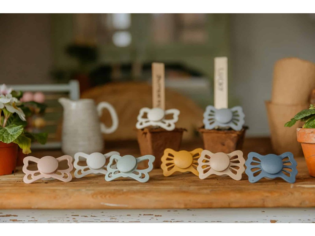 Tvar cumlíka FRIGG Butterfly pripomína motýľa. Štít so zvlnenými okrajmi má veľké vzduchové otvory pre väčšiu bezpečnosť a jeho okrúhly stred krásne zvýrazňuje eleganciu cumlíka.