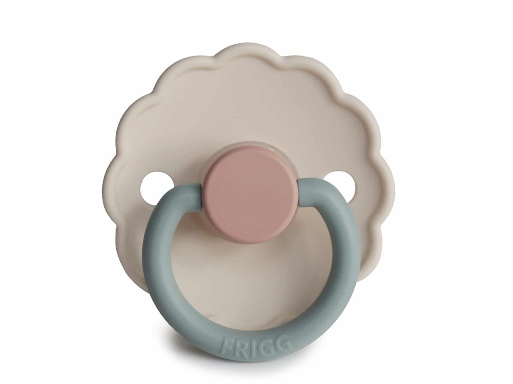 Cumlík je vyrobený zo silikónu medicínskeho stupňa s novým povrchom SilkySoft™, ktorý predstavuje najvyššiu kvalitu silikónu s ešte mäkším povrchom ako predtým, pre prirodzenejšie satie a ešte bezpečnejšiu voľbu pre detské podnebie a ďasná. Každý cumlík je strojovo testovaný na závadnosť, aby sa k našim najdôležitejším zákazníkom dostal vždy perfektný produkt. Tvar štítu je zakrivený jemne smerom von, aby sa zabránilo podráždeniu pokožky. Pre väčšiu bezpečnosť sú v štíte prítomné vzduchové otvory. Nový Click-lock™ systém odlišuje cumlík FRIGG od akéhokoľvek iného cumlíku na trhu. Vďaka novému 4-krokovému procesu spájania jednotlivých častí cumlíka je možné cumlík zostaviť jednoduchým kliknutím, bez použitia akejkoľvek sily. Vďaka tomu je cumlík ešte odolnejší ako predtým. FRIGG je 100% dizajnovaný a vyrobený v Dánsku ako jediná značka cumlíkov na svete! Každý cumlík je zároveň vyrobený na princípe zero-waste, čím sa minimalizuje odpad materiálu vďaka možnosti recyklácie. Cumlíky sú vyrábané s maximálny ohľadom na životné prostredie, a zároveň s dôrazom na uspokojenie potrieb najmenších detí. FRIGG kladie dôraz aj na bezpečnosť – cumlíky sú vyrábané bez BPA, PVC a ftalátov, každý cumlík podstupuje stretch a vacuum test pred uvedením do predaja a sú vyrábané podľa najprísnejšej normy EN1400-A2. Spoznajte svet značky FRIGG, inšpirovaný bohyňou zeme, vzduchu a plodnosti podľa severskej mytológie a nechajte sa zlákať dokonalosťou tvarov a farieb. Cumlík FRIGG Daisy s vrúbkovanými okrajmi, ktoré napodobňujú lupene kvetov, je základom elegantného dizajnu. Kvetinové a moderné detaily upútajú pozornosť každej štýlovej mamičky. Vďaka tomu sa FRIGG perfektne hodí pre dnešné matky, ktoré pri výbere základných potrieb pre bábätko prikladajú veľký význam klasickému dizajnu s modernými prvkami. Vlastnosti: