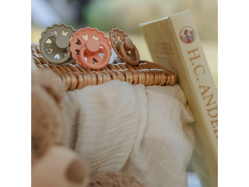 Cumlík je vyrobený z prírodného kaučuku, pričom jeho tvar je zakrivený jemne smerom von, aby sa zabránilo podráždeniu pokožky. Každý cumlík je strojovo testovaný na závadnosť, aby sa k našim najdôležitejším zákazníkom dostal vždy perfektný produkt. Tvar štítu je zakrivený jemne smerom von, aby sa zabránilo podráždeniu pokožky. Pre väčšiu bezpečnosť sú v štíte prítomné vzduchové otvory. Nový Click-lock™ systém odlišuje cumlík FRIGG od akéhokoľvek iného cumlíku na trhu. Vďaka novému 4-krokovému procesu spájania jednotlivých častí cumlíka je možné cumlík zostaviť jednoduchým kliknutím, bez použitia akejkoľvek sily. Vďaka tomu je cumlík ešte odolnejší ako predtým. FRIGG je 100% dizajnovaný a vyrobený v Dánsku ako jediná značka cumlíkov na svete! Každý cumlík je zároveň vyrobený na princípe zero-waste, čím sa minimalizuje odpad materiálu vďaka možnosti recyklácie. Cumlíky sú vyrábané s maximálny ohľadom na životné prostredie, a zároveň s dôrazom na uspokojenie potrieb najmenších detí. FRIGG kladie dôraz aj na bezpečnosť - cumlíky sú vyrábané bez BPA, PVC a ftalátov, každý cumlík podstupuje stretch a vacuum test pred uvedením do predaja a sú vyrábané podľa najprísnejšej normy EN1400-A2. Spoznajte svet značky FRIGG, inšpirovaný bohyňou zeme, vzduchu a plodnosti podľa severskej mytológie a nechajte sa zlákať dokonalosťou tvarov a farieb. Kolekcia cumlíkov FRIGG Fairytale je inšpirovaná umeleckou tvorbou dánskeho autora H.C. Andersena. Vrúbkované okraje a malé srdiečka vo vnútri štítu napodobňujú jeden z jeho papierových výstrižkov. Každá farba cumlíka je pomenovaná podľa jeho známych rozprávok, ktoré dodávajú cumlíkom nádych fantázie. Tento mimoriadne krásny cumlík, s moderným dizajnom a elegantnými detailmi, upúta pozornosť každej štýlovej mamičky. Vlastnosti: