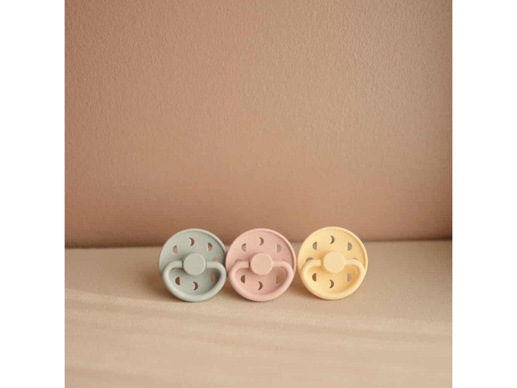 Silikónový cumlík, vhodný pre deti od 6 mesiacov, so vzorom mesiacov.