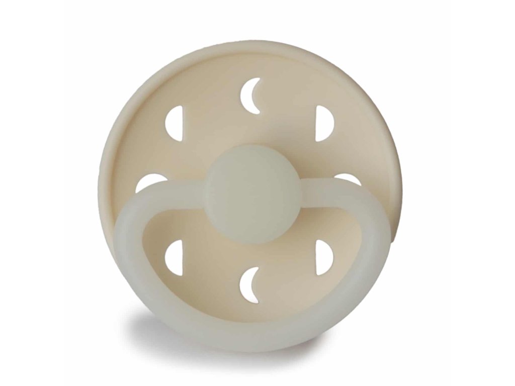 Silikónový cumlík vhodný pre deti od 0-6 mesiacov, svietiaci v tme, so vzorom mesiacov.