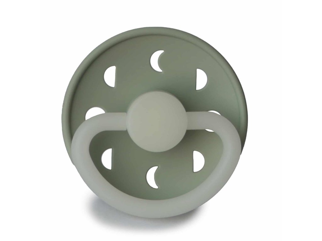 Silikónový cumlík vhodný pre deti od 6 mesiacov, svietiaci v tme, so vzorom mesiacov.