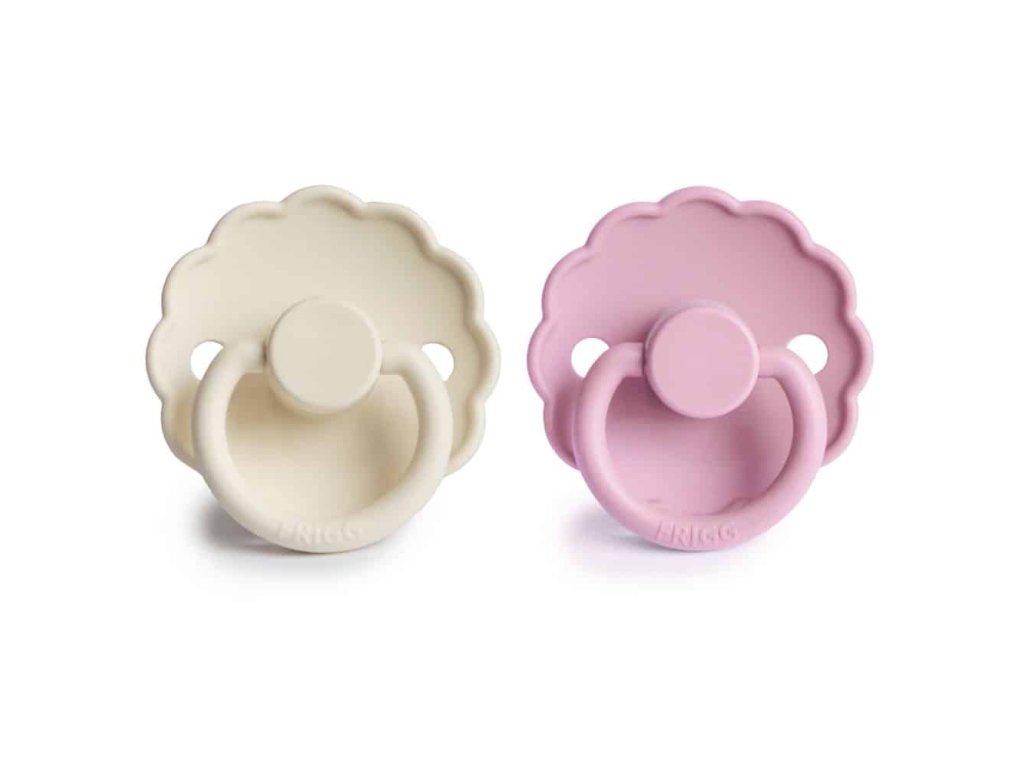 Cumlíky FRIGG Daisy s vrúbkovanými okrajmi, ktoré napodobňujú lupene kvetov, sú podstatou elegantného dizajnu. Kvetinové a moderné detaily upútajú pozornosť každej štýlovo orientovanej mamičky. Vďaka tomu sa FRIGG perfektne hodí pre dnešné matky, ktoré pri výbere základných potrieb pre bábätko prikladajú veľký význam klasickému dizajnu s modernými prvkami. Cumlík FRIGG Daisy plný šarmu je dostupný v monochromatických aj zmiešaných farbách. FRIGG predstavuje novú farbu: LUPINE Kvet vlčieho bôbu s týčiacimi sa hrotmi zdobenými zhlukmi kvetov podobných hrášku je skutočným vizuálnym potešením a inšpiráciou pre túto novú farbu FRIGG; veľmi pekný fialový pastelový odtieň. Fascinujúci kvet lupiny vnáša do dizajnu FRIGG Daisy nádych podmanivej krásy. FRIGG Daisy je cumlík s okrúhlym tvarom. Okrúhly cumlík tvarom aj materiálom pripomína materinský prsník. Vysvetlením je, že keď sa dieťa chystá dojčiť, jazyk sa zroluje okolo bradavky a vytvorí podtlak, ktorý spôsobí tok mlieka. Keď dieťa saje okrúhly cumlík, gúľa okolo neho jazyk rovnako. Okrúhly tvar odporúčajú detskí chiropraktici a pôrodnice v Dánsku. Detaily cumlíka FRIGG: