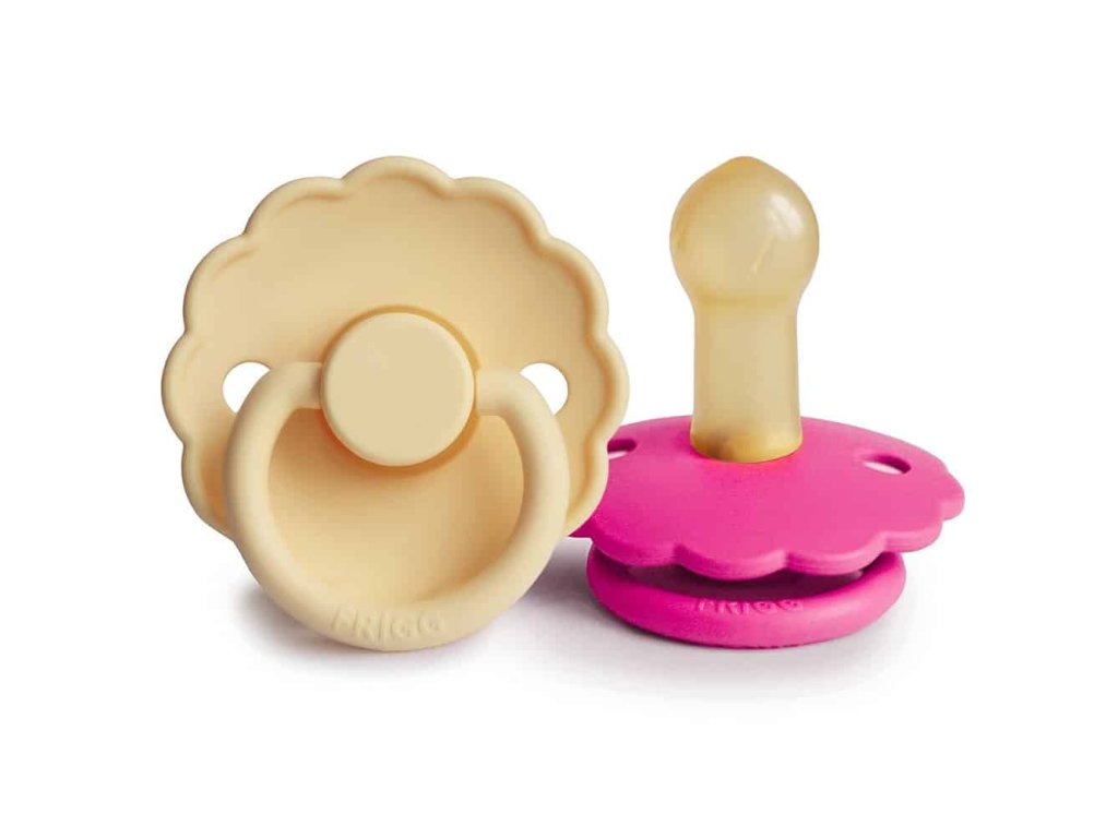 Cumlík FRIGG Daisy s vrúbkovanými okrajmi, ktoré napodobňujú lupene kvetov, je základom elegantného dizajnu. Kvetinové a moderné detaily upútajú pozornosť každej štýlovej mamičky. Vďaka tomu sa FRIGG perfektne hodí pre dnešné matky, ktoré pri výbere základných potrieb pre bábätko prikladajú veľký význam klasickému dizajnu s modernými prvkami. Každý cumlík je strojovo testovaný na závadnosť, aby sa k našim najdôležitejším zákazníkom dostal vždy perfektný produkt. Tvar štítu je zakrivený jemne smerom von, aby sa zabránilo podráždeniu pokožky. Pre väčšiu bezpečnosť sú v štíte prítomné vzduchové otvory. Nový Click-lock™ systém odlišuje cumlík FRIGG od akéhokoľvek iného cumlíku na trhu. Vďaka novému 4-krokovému procesu spájania jednotlivých častí cumlíka je možné cumlík zostaviť jednoduchým kliknutím, bez použitia akejkoľvek sily. Vďaka tomu je cumlík ešte odolnejší ako predtým. FRIGG je 100% dizajnovaný a vyrobený v Dánsku ako jediná značka cumlíkov na svete! Každý cumlík je zároveň vyrobený na princípe zero-waste, čím sa minimalizuje odpad materiálu vďaka možnosti recyklácie. Cumlíky sú vyrábané s maximálny ohľadom na životné prostredie, a zároveň s dôrazom na uspokojenie potrieb najmenších detí. FRIGG kladie dôraz aj na bezpečnosť - cumlíky sú vyrábané bez BPA, PVC a ftalátov, každý cumlík podstupuje stretch a vacuum test pred uvedením do predaja a sú vyrábané podľa najprísnejšej normy EN1400-A2. Spoznajte svet značky FRIGG, inšpirovaný bohyňou zeme, vzduchu a plodnosti podľa severskej mytológie a nechajte sa zlákať dokonalosťou tvarov a farieb. Vlastnosti: