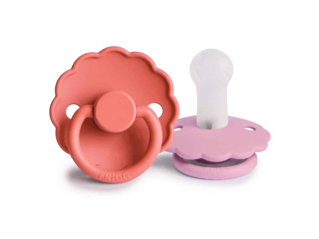 Cumlíky FRIGG Daisy s vrúbkovanými okrajmi, ktoré napodobňujú lupene kvetov, sú podstatou elegantného dizajnu. Kvetinové a moderné detaily upútajú pozornosť každej štýlovo orientovanej mamičky. Vďaka tomu sa FRIGG perfektne hodí pre dnešné matky, ktoré pri výbere základných potrieb pre bábätko prikladajú veľký význam klasickému dizajnu s modernými prvkami. Cumlík FRIGG Daisy plný šarmu je dostupný v monochromatických aj zmiešaných farbách. FRIGG predstavuje novú farbu: LUPINE & POPPY Kvet vlčieho bôbu s týčiacimi sa hrotmi zdobenými zhlukmi kvetov podobných hrášku je skutočným vizuálnym potešením a inšpiráciou pre túto novú farbu FRIGG; veľmi pekný fialový pastelový odtieň. Fascinujúci kvet lupiny vnáša do dizajnu FRIGG Daisy nádych podmanivej krásy. FRIGG Daisy je cumlík s okrúhlym tvarom. Okrúhly cumlík tvarom aj materiálom pripomína materinský prsník. Vysvetlením je, že keď sa dieťa chystá dojčiť, jazyk sa zroluje okolo bradavky a vytvorí podtlak, ktorý spôsobí tok mlieka. Keď dieťa saje okrúhly cumlík, gúľa okolo neho jazyk rovnako. Okrúhly tvar odporúčajú detskí chiropraktici a pôrodnice v Dánsku. Detaily cumlíka FRIGG: