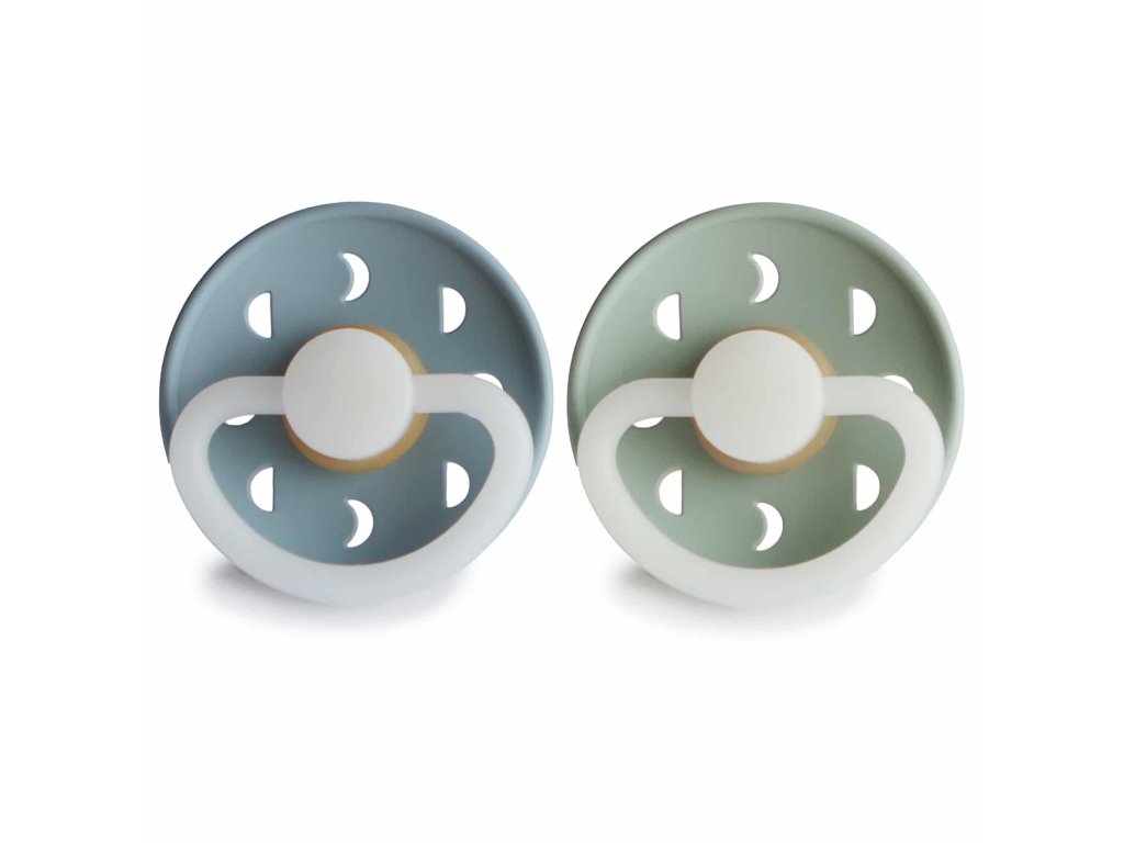 Dvojbalenie kaučukových cumlíkov vhodných pre deti od 6 mesiacov, svietiacich v tme, so vzorom mesiacov.