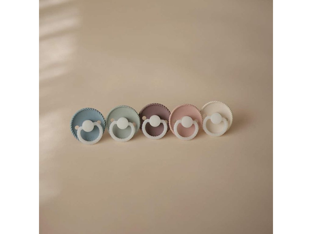 Cumlík je vyrobený zo silikónu medicínskeho stupňa s novým povrchom SilkySoft™, ktorý predstavuje najvyššiu kvalitu silikónu s ešte mäkším povrchom ako predtým, pre prirodzenejšie satie a ešte bezpečnejšiu voľbu pre detské podnebie a ďasná. Každý cumlík je strojovo testovaný na závadnosť, aby sa k našim najdôležitejším zákazníkom dostal vždy perfektný produkt. Tvar štítu je zakrivený jemne smerom von, aby sa zabránilo podráždeniu pokožky. Pre väčšiu bezpečnosť sú v štíte prítomné vzduchové otvory. Nový Click-lock™ systém odlišuje cumlík FRIGG od akéhokoľvek iného cumlíku na trhu. Vďaka novému 4-krokovému procesu spájania jednotlivých častí cumlíka je možné cumlík zostaviť jednoduchým kliknutím, bez použitia akejkoľvek sily. Vďaka tomu je cumlík ešte odolnejší ako predtým. FRIGG je 100% dizajnovaný a vyrobený v Dánsku ako jediná značka cumlíkov na svete! Každý cumlík je zároveň vyrobený na princípe zero-waste, čím sa minimalizuje odpad materiálu vďaka možnosti recyklácie. Cumlíky sú vyrábané s maximálny ohľadom na životné prostredie, a zároveň s dôrazom na uspokojenie potrieb najmenších detí. FRIGG kladie dôraz aj na bezpečnosť - cumlíky sú vyrábané bez BPA, PVC a ftalátov, každý cumlík podstupuje stretch a vacuum test pred uvedením do predaja a sú vyrábané podľa najprísnejšej normy EN1400-A2. Spoznajte svet značky FRIGG, inšpirovaný bohyňou zeme, vzduchu a plodnosti podľa severskej mytológie a nechajte sa zlákať dokonalosťou tvarov a farieb. Vlastnosti: