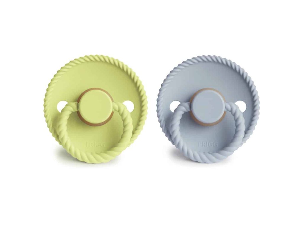 Dvojbalenie okrúhlych kaučukových cumlíkov, vhodné pre deti vo veku 6-18 mesiacov, so vzorom lana.