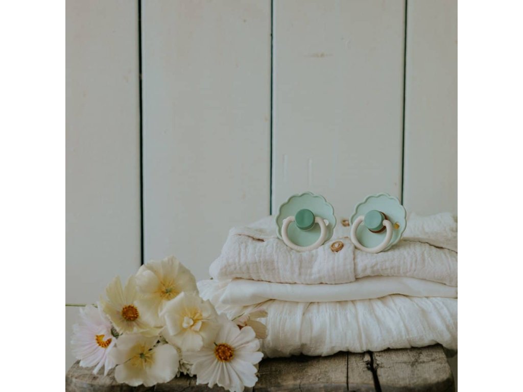 Cumlík FRIGG Daisy s vrúbkovanými okrajmi, ktoré napodobňujú lupene kvetov, sú podstatou elegantného dizajnu. Kvetinové a moderné detaily upútajú pozornosť každej štýlovo orientovanej mamičky. Vďaka tomu sa FRIGG perfektne hodí pre dnešné matky, ktoré pri výbere základných potrieb pre bábätko prikladajú veľký význam klasickému dizajnu s modernými prvkami.