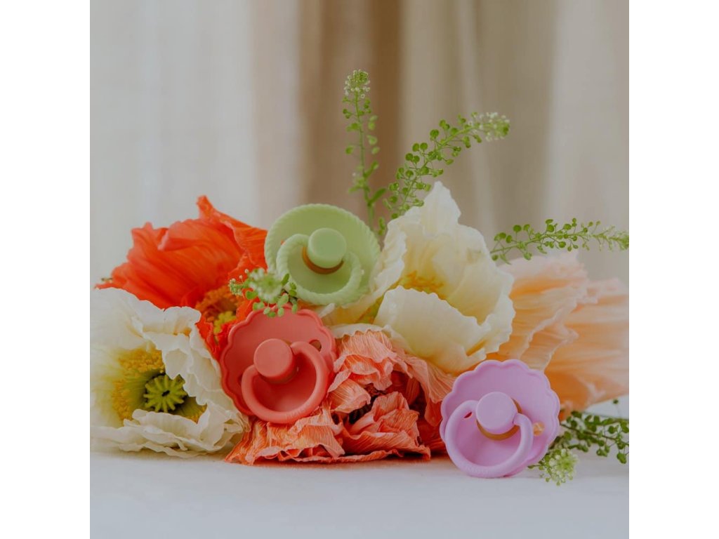Okrúhly kaučukový cumlík, vhodný pre deti vo veku 6-18 mesiacov, so vzorom kvetu.