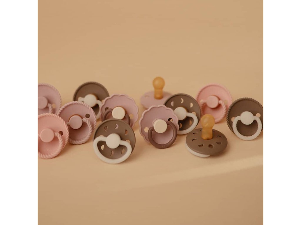 FRIGG Nočný cumlík s funkciou svietenia v tme. Rukoväť a gombík budú svietiť v tme a vyriešia problém nájsť a umiestniť cumlík vášho dieťaťa uprostred noci. Funkcia nočného žiarenia je jemne jasná a nepoškodí oči vášho dieťaťa a cumlík môžete ľahko nájsť bez zapnutia svetla. Cumlík FRIGG Night je 100% navrhnutý a vyrobený v Dánsku ako jediná značka cumlíkov na svete. Ako rozžiariť cumlík FRIGG Night: Podržte cumlík vo svetle, aby ste aktivovali funkciu žiary. FRIGG Moon Phase je cumlík inšpirovaný Mesiacom v pohybe. Posunujúce sa fázy mesiaca sa odrážajú na štíte cumlíka a fungujú ako vzduchové otvory na vetranie citlivej detskej pokožky. Inšpirácia Moon Phase pokračuje v rukoväti v tvare polmesiaca. FRIGG Moon Phase je okrúhly cumlík s okrúhlym tvarom cumlíka. Okrúhly cumlík tvarom aj materiálom pripomína materinský prsník. Vysvetlením je, že keď sa dieťa chystá dojčiť, jazyk sa zroluje okolo bradavky a vytvorí podtlak, ktorý spôsobí tok mlieka. Keď dieťa saje okrúhly cumlík, gúľa okolo neho jazyk rovnako. Okrúhly tvar odporúčajú detskí chiropraktici a pôrodnice v Dánsku. Detaily cumlíka FRIGG