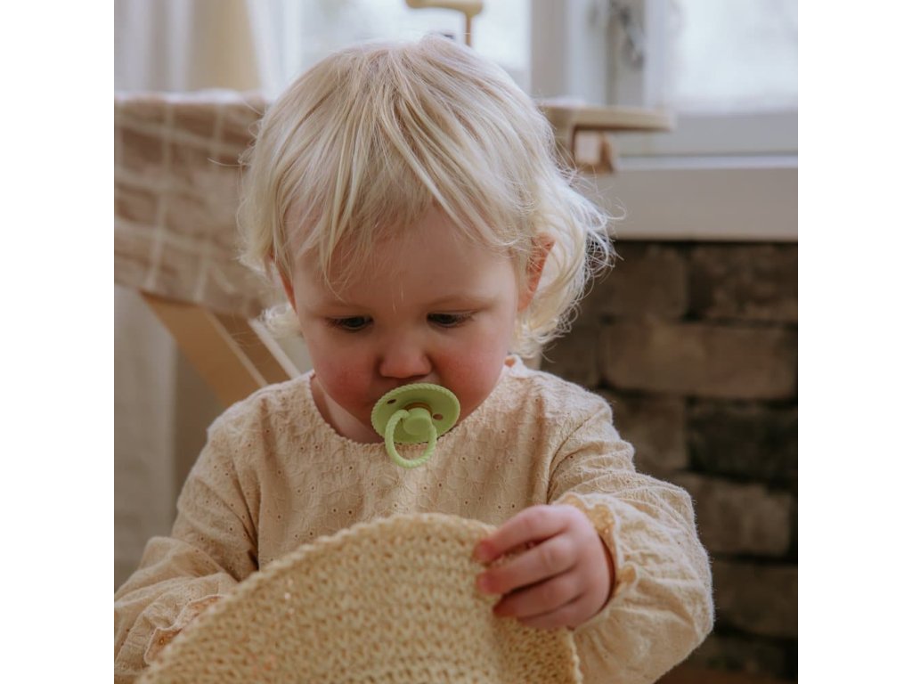 FRIGG Rope vás prinúti myslieť na dobrodružstvá zahŕňajúce silu. Lano je nevyhnutnou súčasťou pri turistike alebo lezení. Predstavuje bezpečnosť a stabilitu, keď sa aktivity stanú riskantnými alebo nepredvídateľnými. Toto je základnou inšpiráciou dizajnu cumlíka FRIGG Rope. Inšpirácia povrazom je zreteľná v dizajne cumlíka, pretože tenké povrazy obopínajú štít a hrubšie povrazy sú použité ako rúčka. FRIGG Rope je pre chlapcov aj dievčatá, ktorí milujú veľké dobrodružstvo... FRIGG predstavuje novú farbu: GREEN TEA Zelený čaj, ktorý pochádza z rastliny Camellia sinensis a je obľúbený pre svoju jemnú chuť v rôznych kultúrach, je inšpiráciou pre túto novú farbu FRIGG: jasne zelený odtieň, ktorý dodáva lano FRIGG štipku šťastia, optimizmu a sviežosti. cumlík. Okrúhly cumlík tvarom aj materiálom pripomína materinský prsník. Vysvetlením je, že keď sa dieťa chystá dojčiť, jazyk sa zroluje okolo bradavky a vytvorí podtlak, ktorý spôsobí tok mlieka. Keď dieťa saje okrúhly cumlík, gúľa okolo neho jazyk rovnako. Okrúhly tvar odporúčajú detskí chiropraktici a pôrodnice v Dánsku. Detaily cumlíka FRIGG