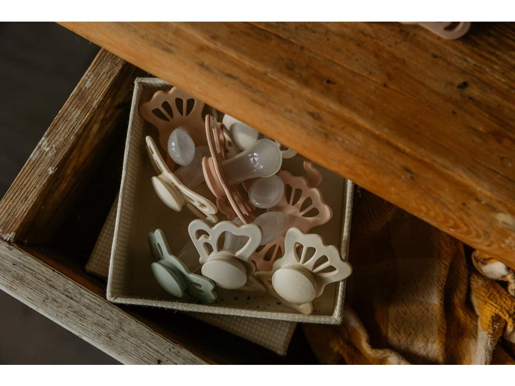 FRIGG Lucky je symetrický cumlík s mierne splošteným cumlíkom v tvare slzy. Symetrický cumlík vždy správne sedí v ústach dieťaťa, bez ohľadu na to, či je otočený nahor alebo dole. Cumlík je navrhnutý s plochejším krkom, aby sa znížil tlak na podnebie, ďasná a tiež znížilo riziko krivých zubov a krivého zhryzu. Ortodontický dizajn je ideálny pre podporu správneho vývoja detských zubov, čeľuste a podnebia. Každý cumlík je strojovo testovaný na závadnosť, aby sa k našim najdôležitejším zákazníkom dostal vždy perfektný produkt. FRIGG Lucky je inšpirovaný štvorlístkom. Štít má zvlnené okraje, ktoré sú v tvare listov štvorlístka a tieto listy fungujú ako vzduchové otvory. Okrúhly stred zvýrazňuje eleganciu cumlíka. Štvorlístok je všeobecne uznávaným symbolom šťastia kvôli svojej vzácnosti. FRIGG Lucky je vyrobený tak, aby poskytoval deťom upokojujúce pocity a prinášal im šťastie. Tento cumlík je kúzlom pre šťastie, ktoré rozjasní život každého dieťaťa. Nový Click-lock™ systém odlišuje cumlík FRIGG od akéhokoľvek iného cumlíku na trhu. Vďaka novému 4-krokovému procesu spájania jednotlivých častí cumlíka je možné cumlík zostaviť jednoduchým kliknutím, bez použitia akejkoľvek sily. Vďaka tomu je cumlík ešte odolnejší ako predtým. FRIGG je 100% dizajnovaný a vyrobený v Dánsku ako jediná značka cumlíkov na svete! Každý cumlík je zároveň vyrobený na princípe zero-waste, čím sa minimalizuje odpad materiálu vďaka možnosti recyklácie. Cumlíky sú vyrábané s maximálny ohľadom na životné prostredie, a zároveň s dôrazom na uspokojenie potrieb najmenších detí. FRIGG kladie dôraz aj na bezpečnosť - cumlíky sú vyrábané bez BPA, PVC a ftalátov, každý cumlík podstupuje stretch a vacuum test pred uvedením do predaja a sú vyrábané podľa najprísnejšej normy EN1400-A2. Detaily cumlíka FRIGG Lucky