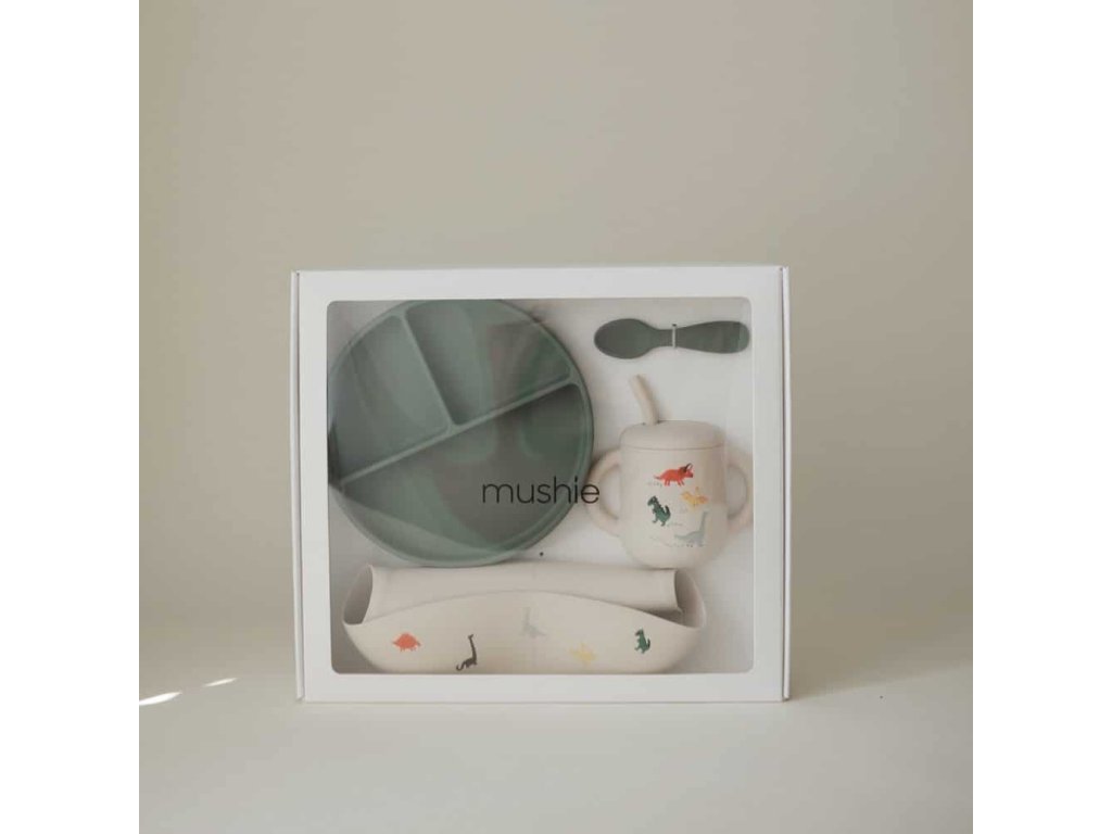 Roztomilý a praktický silikónový jedálenský set Mushie – Dinosaurs pomáha batoľatám učiť sa samostatne jesť s radosťou a štýlom.