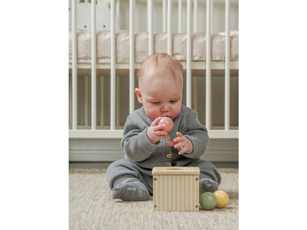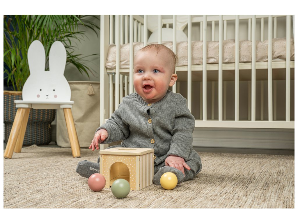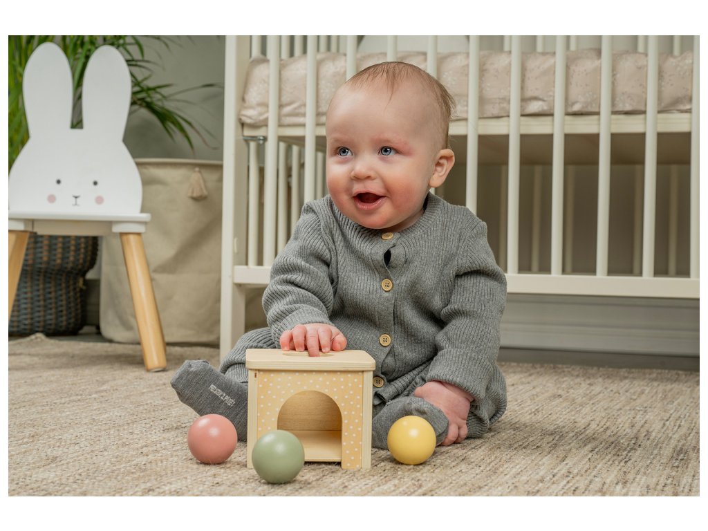 Play and Learn box od Jabadabado obsahuje päť starostlivo vybraných hračiek navrhnutých tak, aby ponúkli dieťaťu hru a podporilovali jeho vývoj. Každá hračka má jasný účel umožniť bábätku vo veku 6-12 mesiacov rozvíjať motorické zručnosti a stimulovať kognitívne schopnosti. Vytiahnite veľrybu. Táto veľryba môže fungovať ako ťažné zviera aj ako malé auto. Hračka má rozkošný tvar veľryby a rukoväť navrhnutú pre ľahké uchopenie malými ručičkami. Prostredníctvom tejto zábavnej hračky si bábätká môžu precvičiť pohyby rúk a motoriku. Drevené knižné zvieratká. Prvá malá drevená knižka bábätka s ôsmimi stranami zdobená zvieracími motívmi. Knižka sa bábätku ľahko drží a malé ručičky ľahko otáčajú každú stránku. Prvá hádanka. Objavte zábavu nášho prvého puzzle pre batoľatá! Toto puzzle dokonale prispôsobené malým ručičkám posilňuje koordináciu, jemnú motoriku a zručnosti pri riešení problémov a poskytuje zábavný začiatok záhadných dobrodružstiev vášho dieťaťa. Hrajte a učte sa v jednom! Play drop box. Tento box podporuje rozvoj koordinácie očí a rúk u detí a stimuluje jemné motorické zručnosti a zároveň prebúdza zvedavosť už od útleho veku. Posilňuje pozorovacie schopnosti dieťaťa a pozorovaním, ako loptička mizne v škatuli a potom sa vyjde, dieťa začína chápať stálosť vecí. Stohoací Medvedík. Stohovací medvedík obsahuje päť farebných okrúhlych stohovacích krúžkov a top v tvare medveďa. Táto hračka podporuje jemnú motoriku, koncentráciu, rozsah pozornosti, koordináciu ruka-oko, priestorové vnímanie a riešenie problémov. Rozmery produktu: 27 x 29 x 14 cm Rozmery balenia: 27 x 29 x 14 cm Materiál: papier, preglejka, borievkové drevo, mdf, bavlnená šnúrka Bezpečnosť: Testované a certifikované podľa európskych noriem