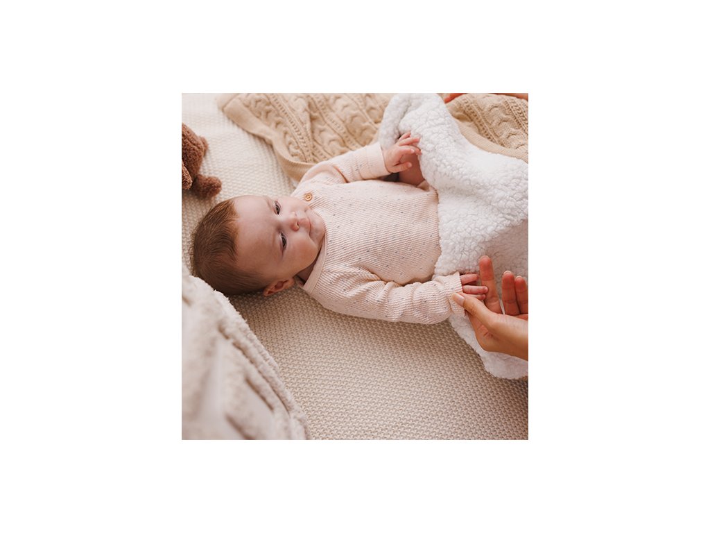 Táto dvojvrstvová deka je ideálnou voľbou pre chladnejšie dni. Vrchná vrstva je vyrobená z prírodnej bavlny – jemnej a bezpečnej pre citlivú pokožku dieťaťa. Spodná strana je podšitá hustou sherpa látkou (flísom), ktorá pripomína jahňaciu kožušinu a výborne izoluje teplo. Deka nedráždi pokožku, vytvára pocit bezpečia a pohodlia, takže vaše dieťa sa bude cítiť ako v mäkkom, teplom obláčiku. Ideálna pre novorodencov, dojčatá aj staršie deti – doma, na prechádzkach či na cestách.