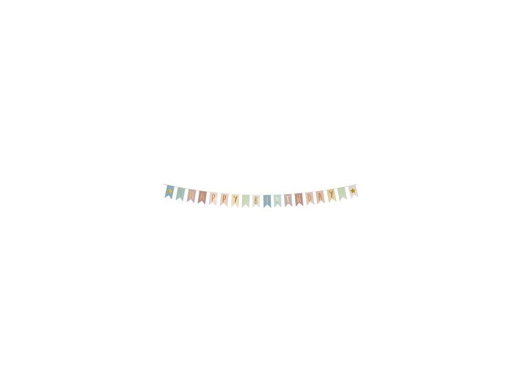 Veselá a slavnostní dekorace pro narozeninové oslavy. Každý praporek nese jednu písmeno nápisu „Happy Birthday“ . Skvělý doplněk, který okamžitě navodí oslavenou atmosféru. Délka girlandy: 3,5 m, velikost každého praporku: 11 × 20 cm.