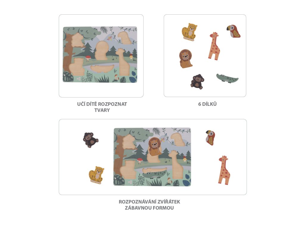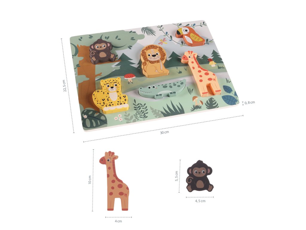 Drevené puzzle Džungľa sú skvelým spôsobom, ako deťom predstaviť divoké zvieratá a rastliny džungle, a to všetko v bezpečí vášho domova. S každým ďalším dielikom, ktorý vaše dieťa pridá, ožívajú pred jeho očami farby a tvary džungle, čím sa rozvíjajú jeho schopnosti rozpoznávania obrázkov a zlepšuje sa jemná motorika.