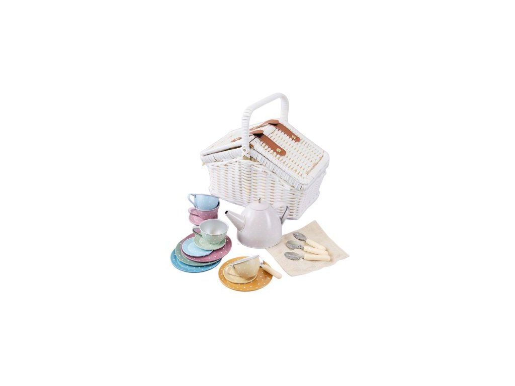 Roztomilý piknikový košík s kompletním 18dílným čajovým servisem. Ideální pro pikniky, hru v dětském pokoji nebo venku s kamarády a plyšáky. Obsahuje vše potřebné pro čajovou párty: konvička, 4 šálky, 4 podšálky, 4 talířky na dezerty a 4 lžičky. Košík se uzavírá malým knoflíkem a snadno se přenáší.