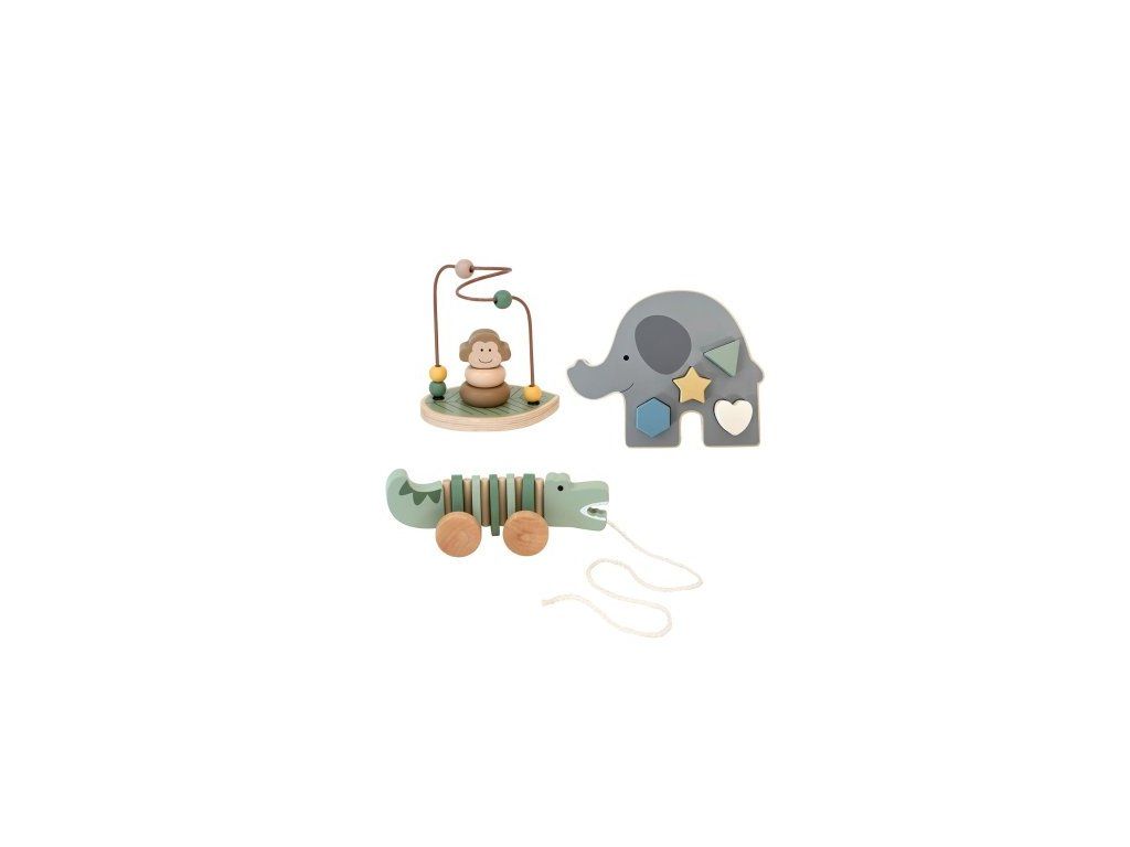 Obsah balení: tahací krokodýl, puzzle slon, labyrint s korálky a opičkou