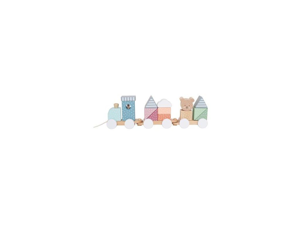 Roztomilá tahací hračka ve tvaru vláčku se 3 vozíky. Vozíky lze oddělit nebo spojit dohromady. Děti mohou na vozíky skládat 12 různých kostek s barevnými a vzorovanými motivy.