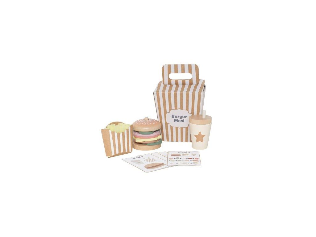 Kompletní hamburgerové menu pro malé hladovce. Stohovatelný burger s různými přísadami: houska, okurka, burger, sýr, rajče a salát. Součástí hraní jsou hranolky a 4 jídelní karty s nápady na kombinace menu.