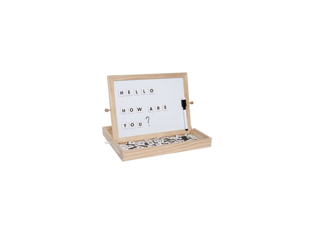 Interaktivní hračka podporující učení písmen a čísel zábavnou formou. Obsahuje bílou tabulku s fixem pro opakované psaní a mazání. Odnímatelné destičky s písmeny, čísly a speciálními znaky, včetně skandinávských a německých písmen Vše uloženo v praktické a odolné. dřevěné krabičce, která zároveň slouží jako psací plocha. Rozvíjí jazykové a matematické dovednosti, podporuje tvořivost a logické myšlení