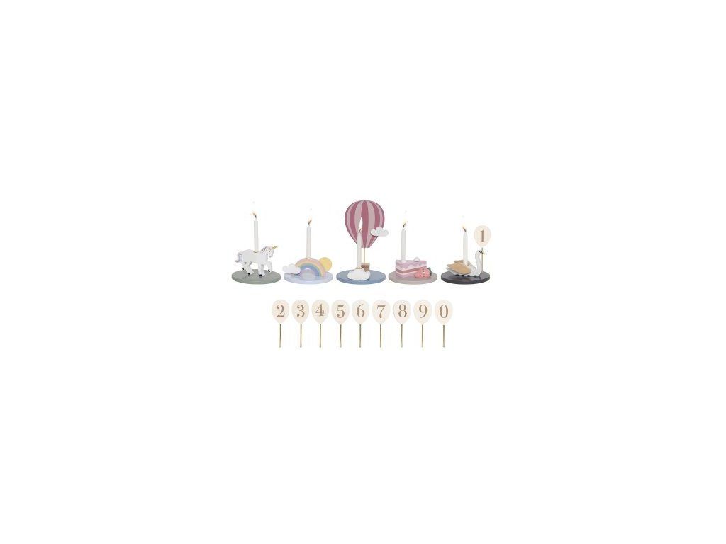 Dřevěný narozeninový vláček složený z pěti svícnů – lze používat společně jako vláček nebo jednotlivě. Figury zahrnují labuť, duhu, horkovzdušný balón, narozeninový dort a jednorožce. Součástí jsou balónky s čísly 0–9, které lze připevnit ke svícnům a označit věk oslavence.