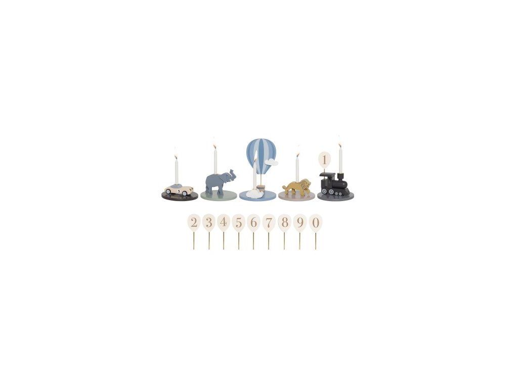 Dřevěný narozeninový vláček složený z pěti svícnů – lze používat společně jako vláček nebo jednotlivě. Figury zahrnují lokomotivu, lva, horkovzdušný balón, slona a sportovní auto. Součástí jsou balónky s čísly 0–9, které lze připevnit ke svícnům a označit věk oslavence.