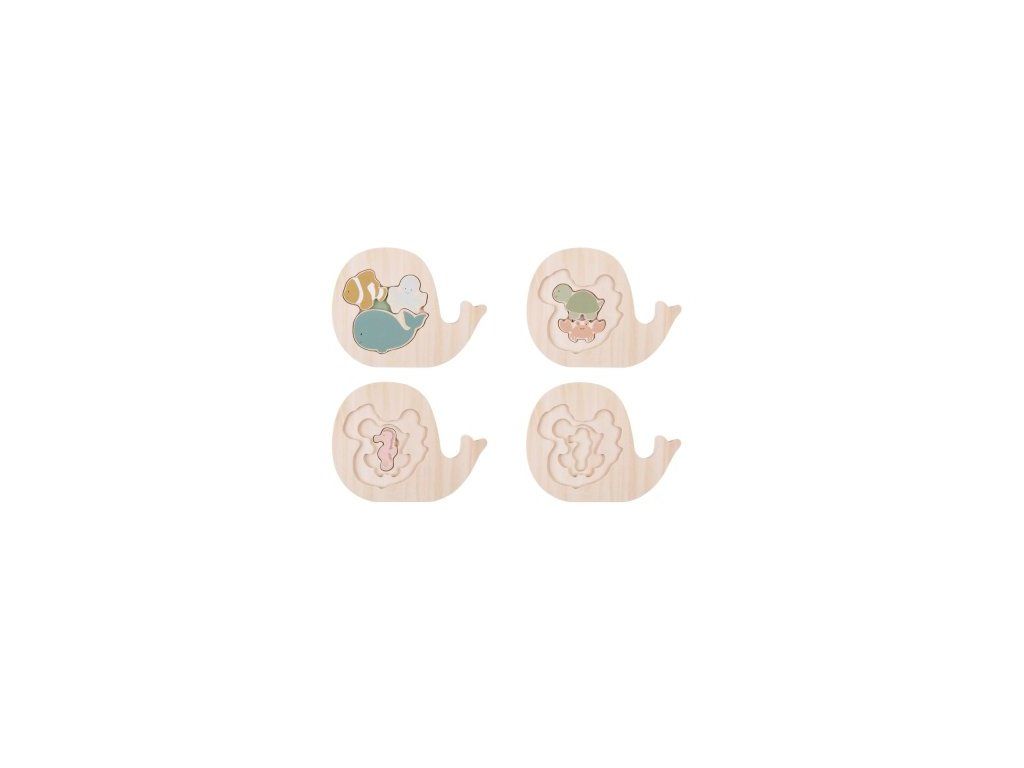 Puzzle se skládá ze šesti vrstev ve tvaru mořských zvířátek. Vrstvené díly rozvíjejí jemnou motoriku a pozornost dítěte. Dílky jsou snadno uchopitelné a vhodné pro malé ruce. Roztomilé figurky lze použít i samostatně pro hru.