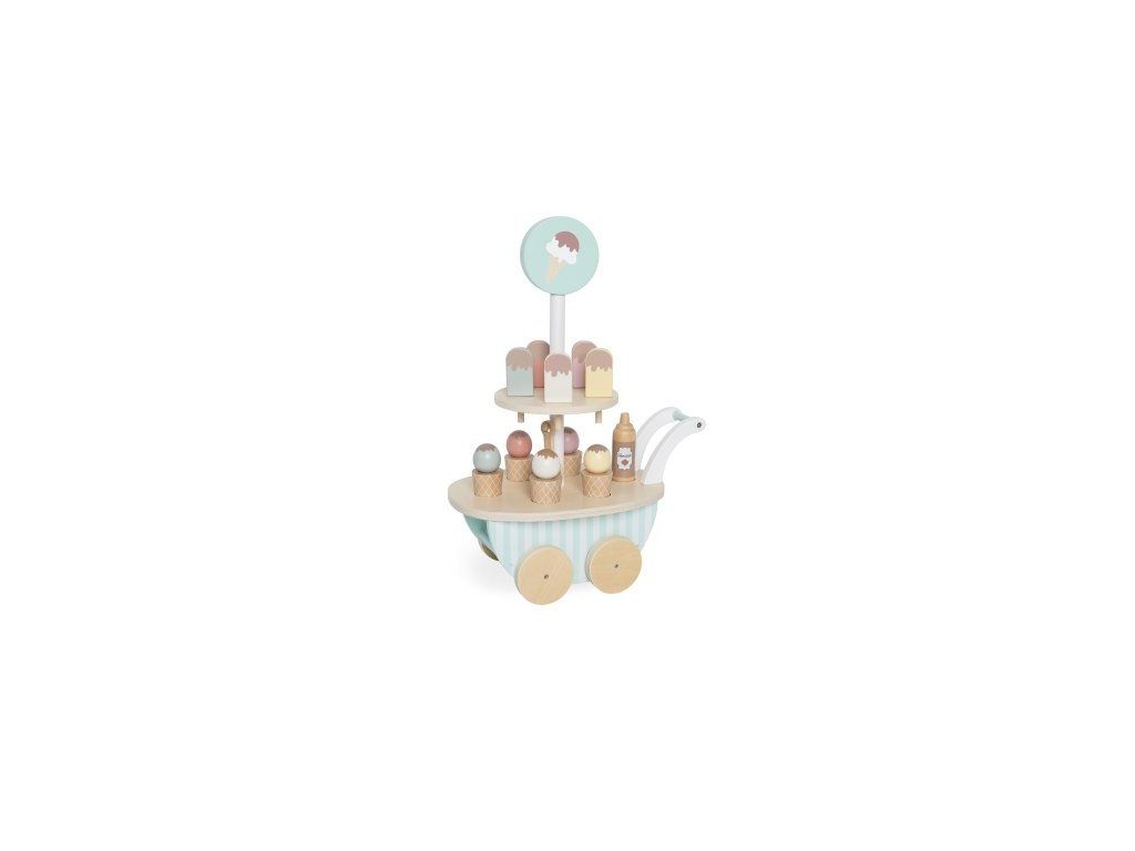Vozík se zmrzlinou na kolečkách, který zabaví děti na dlouhé hodiny. Obsahuje 10 druhů zmrzlin – kornouty i nanuky. Součástí je zmrzlinová naběračka a lahodná čokoládová poleva. Vozík lze snadno přesouvat po zemi nebo postavit na stů.l Vyroben z kvalitního dřeva, bezpečný pro děti.