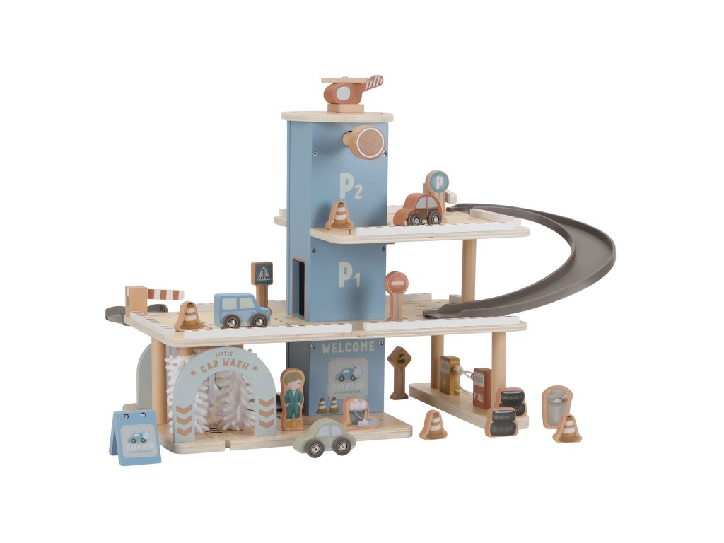 Zaparkuj, natankuj a hurá na výlet! Garáž má prízemie s umývačkou, dve poschodia na parkovanie, nabíjaciu stanicu pre elektromobily a pristávaciu plochu pre vrtuľník na streche. V balení ďalej nájdete tri drevené autíčka, vrtuľník, figúrku vodiča a ďalšie doplnky (dopravné značky, kužele, pneumatiky, vedro atď.).