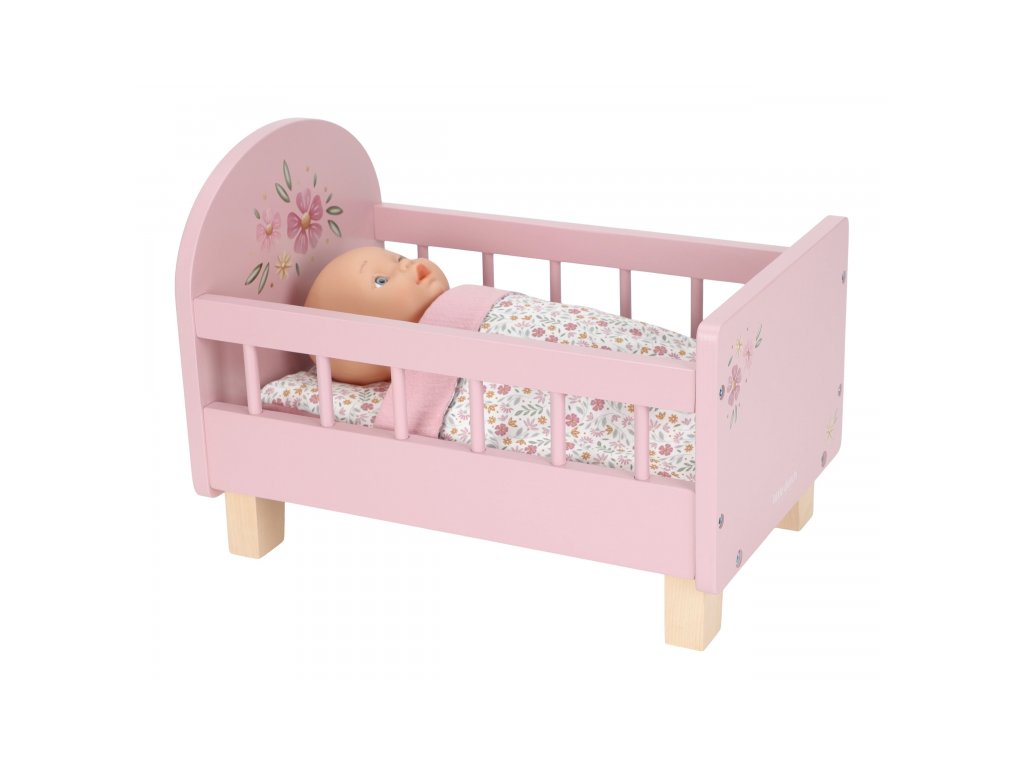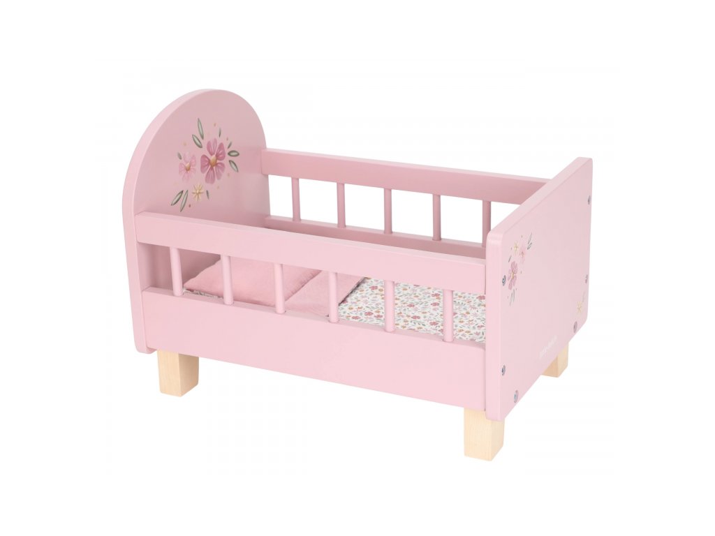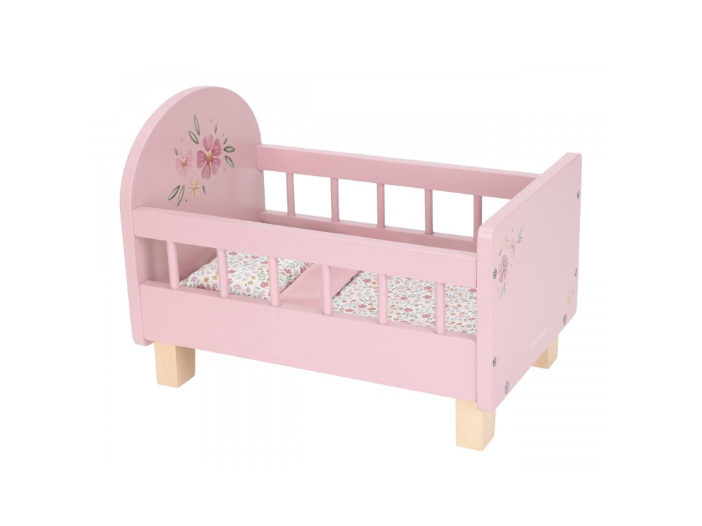 V tejto krásnej drevenej postieľke bude každá bábika spať mäkko a pohodlne. Súčasťou je mäkučký vankúšik, hrejivá perinka a matrac - všetko zladené v kúzelnom kvetinovom dizajne. Elegantné nôžky v prírodnej farbe a jemná kvetinová ilustrácia dodávajú postieľke romantický nádych a robia z nej nádherný doplnok každej izbičky.