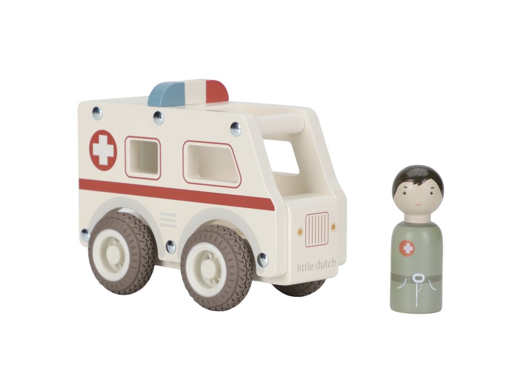 Záchranka je na ceste! Drevená sanitka s realistickými detailmi a kolieskami s gumovými pneumatikami je pripravená rýchlo dopraviť pacienta do nemocnice. Vďaka otvorenému dizajnu sa ľahko drží a ovláda aj malými detskými ručičkami.