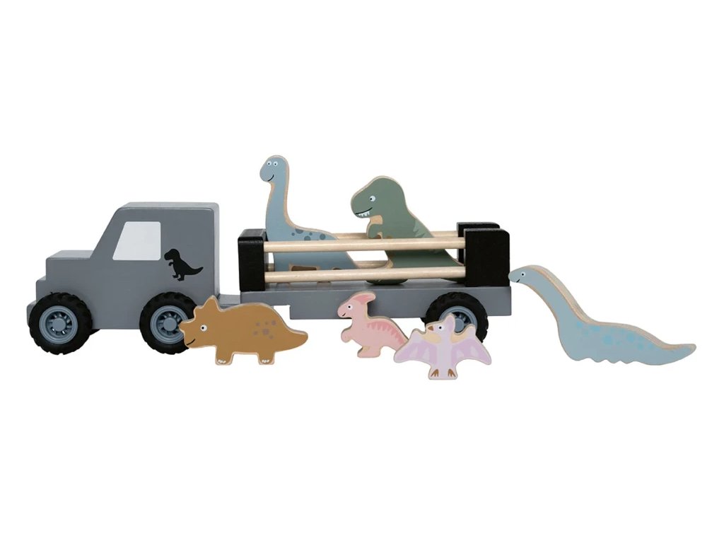 Teraz môžu malí dobrodruhovia spojiť lásku k dinosaurom aj vozidlám s pôvabným prívesom Trailer Dino! Tento hravý drevený príves je nabitý roztomilými dinosaurami a priamo vyzýva k tvorivej a fantazijnej hre. Deti môžu svojich dinosaurov prevážať, vykladať, nakladať a vymýšľať si vlastné napínavé príbehy. Vylepšený dizajn s gumenými kolieskami zaisťuje plynulejšiu jazdu a štýlový vzhľad. Ideálne pre všetkých malých nadšencov dinosaurov a vozidiel, ktorí chcú vyraziť na nové dobrodružstvá so svojimi obľúbencami! Vyrobené z dreva s certifikáciou FSC™ (FSC™C194598). Informácie o produkte: Rozmery produktu: 12 × 32 × 11,5 cm Rozmery balenia: 12,2 × 34 × 12,8 cm Materiál: preglejka, teawood, bukové drevo, borovicové drevo Bezpečnosť: Testované a certifikované podľa európskych noriem Balenie: 6 ks