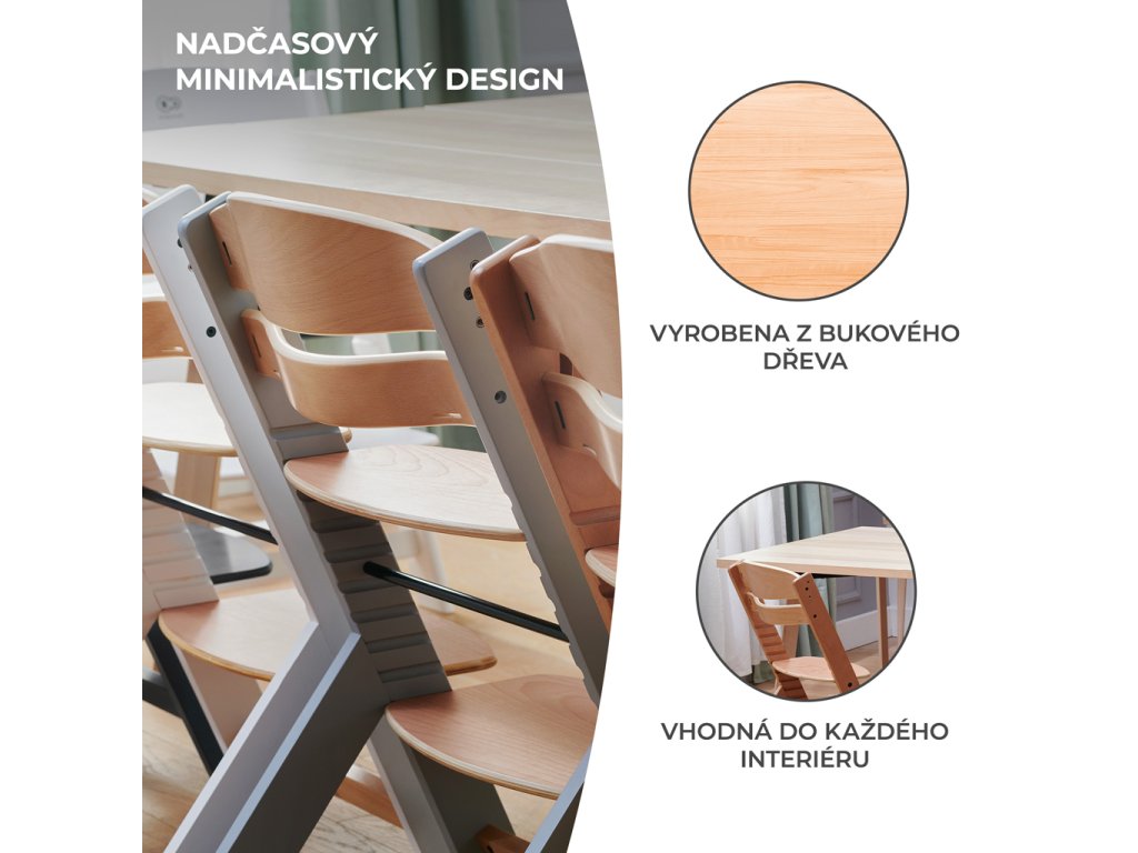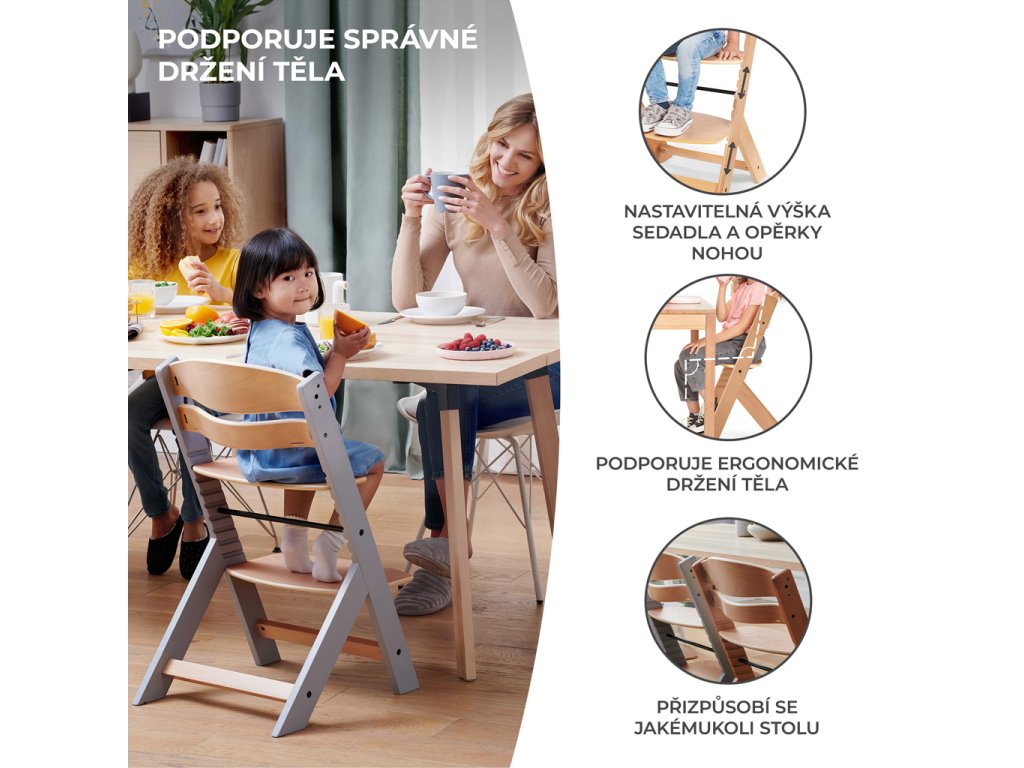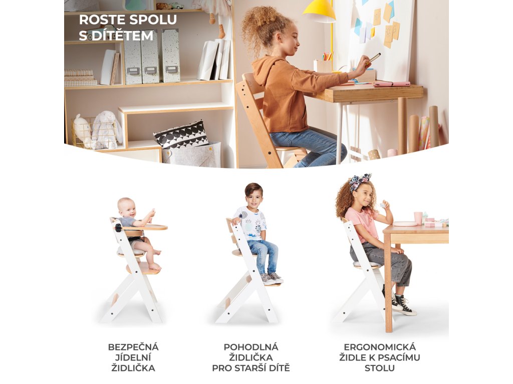 Existuje vôbec vysoká stolička na kŕmenie, ktorá bude slúžiť dieťaťu niekoľko rokov? Áno! Takou stoličkou je práve ENOCK. Tento nadčasový kus nábytku je bezpečnou a praktickou stoličkou na kŕmenie a ergonomickou stoličkou pre staršie deti. Ako je to možné? Výška sedadla a opierky nohy sú nastaviteľné, čo uľahčuje nastavenie vysokej stoličky podľa veku dieťaťa. ENOCK je navrhnutý pre vašu rodinu - je to stolička, ktorá sa zmestí do interiéru vášho domova a neskôr bude slúžiť vášmu dieťaťu ako detská stolička alebo stolička k pracovnému stolu. A čo viac - bez problémov ju zladíte so stolom v kuchyni, jedálni alebo v obývacej izbe. Vďaka profilovanej základni si dieťa zachová správne držanie tela pri jedle a bude tiež schopné tráviť čas spolu s dospelými pri stole.