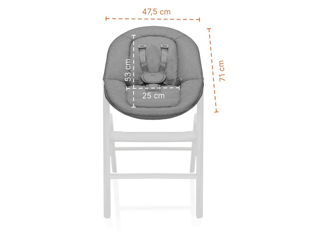 Novorodenecký set je určený pre bábätká od narodenia do 9 kg. Ponúka pohodlnú a bezpečnú polohu s možnosťou nastavenia sklonu chrbtovej opierky, mäkkým, priedušným polstrovaním a päťbodovým bezpečnostným pásom. Vďaka výške stoličky je dieťa zapojené do diania pri stole už od prvých dní.