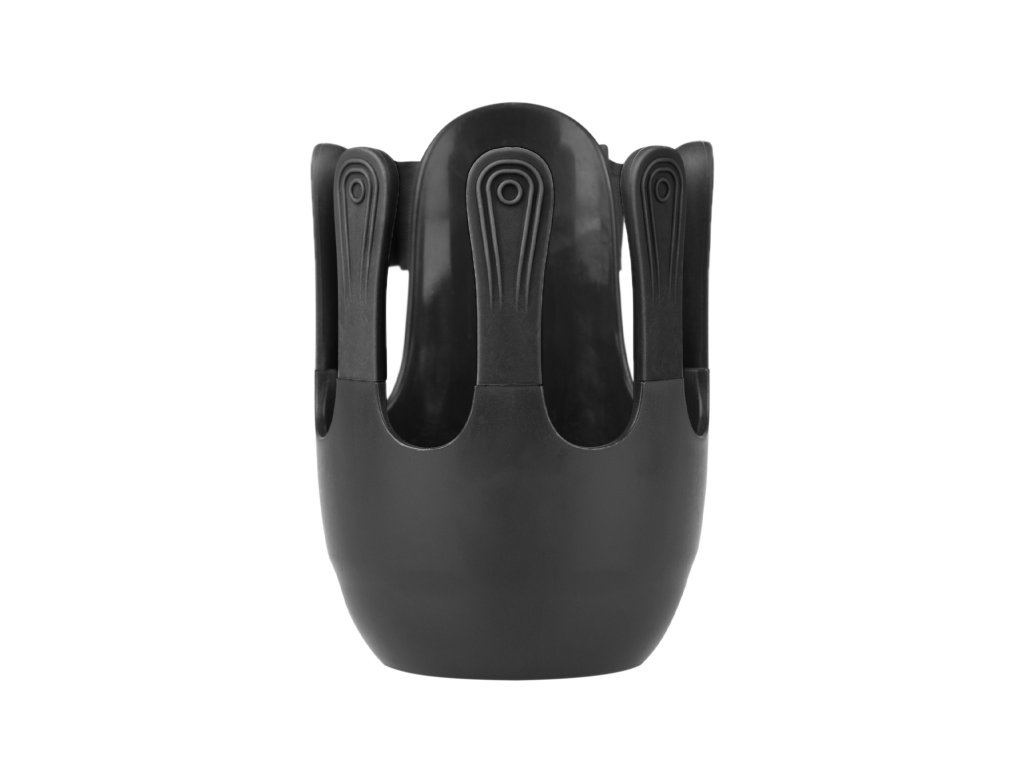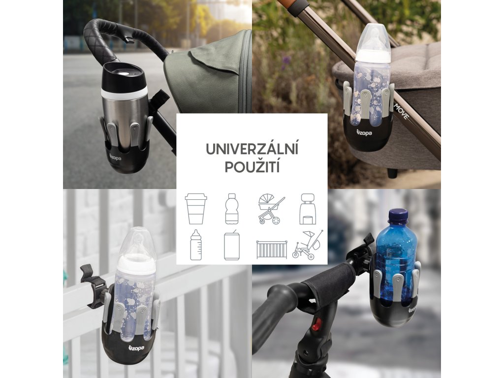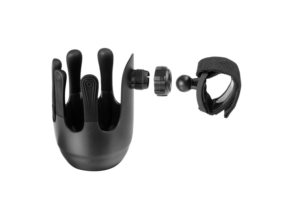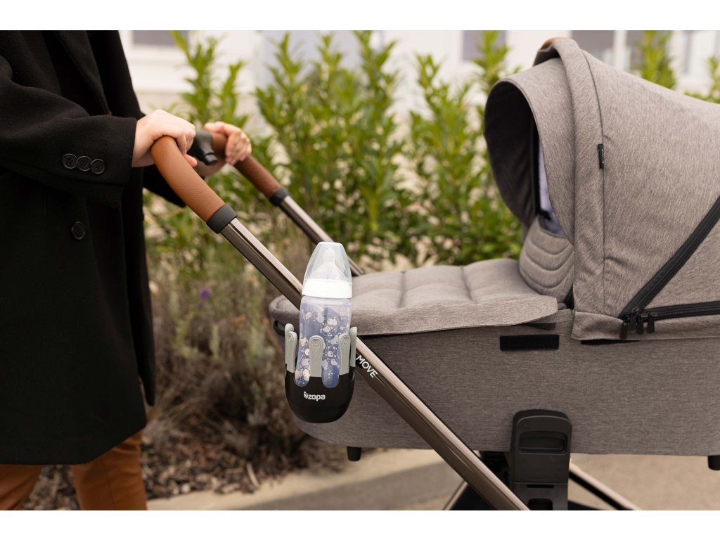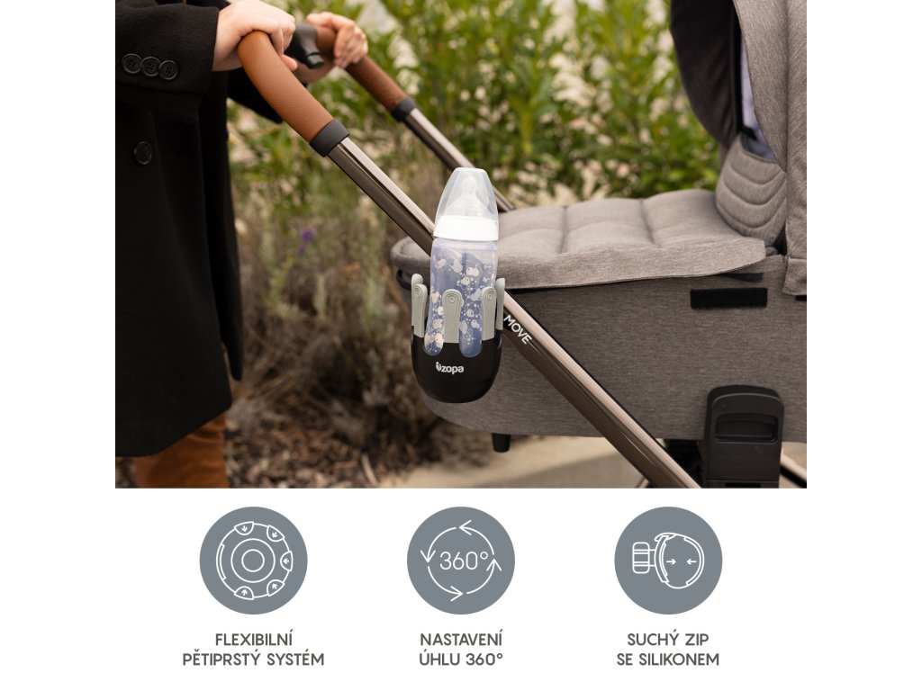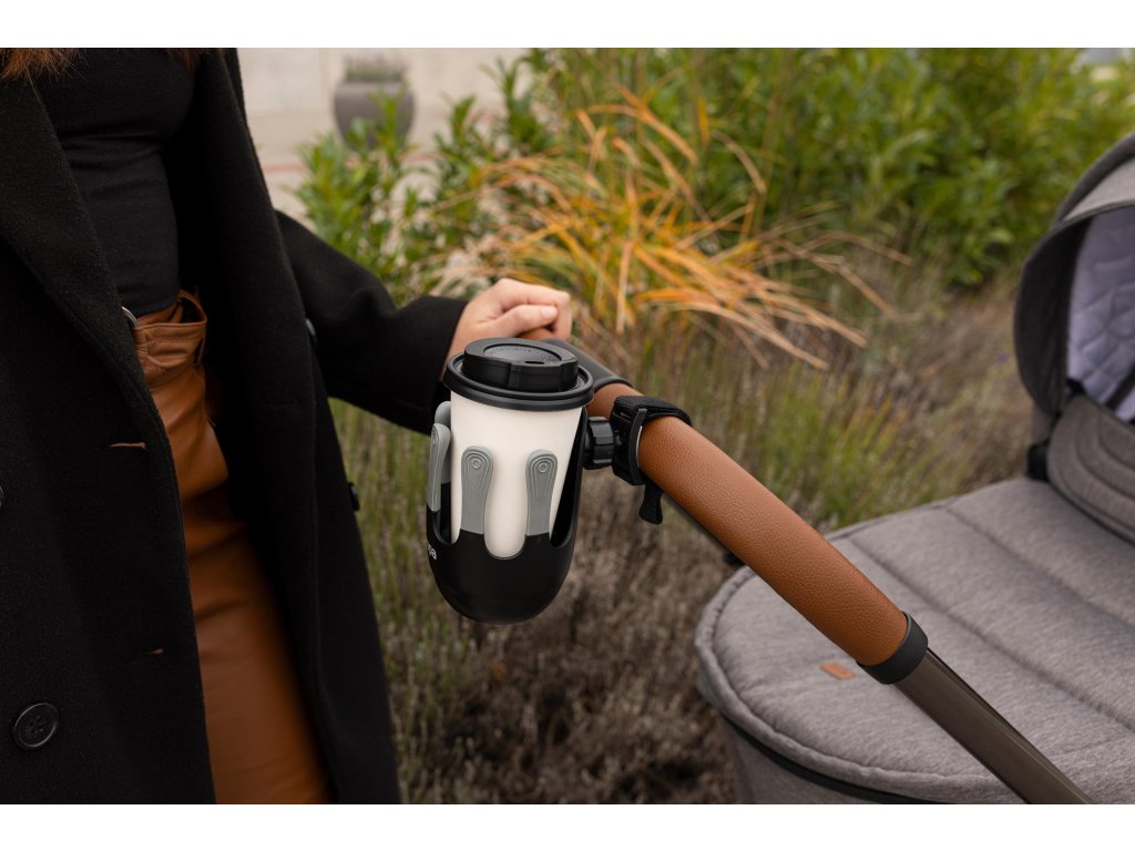 Flexibilný držiak na nápoje je navrhnutý tak, aby sa doň zmestili detské fľaše, šálky na kávu a väčšie fľaše na vodu s priemerom do 8,5 cm. 360° otočný systém možno vďaka jednoduchej inštalácii na suchý zips pripevniť na rukoväť takmer každého kočíka. Jedinečný, moderne vyzerajúci systém piatich prstov zaisťuje lepšiu stabilitu pohára alebo fľaše a zabraňuje náhodnému vyliatiu.
