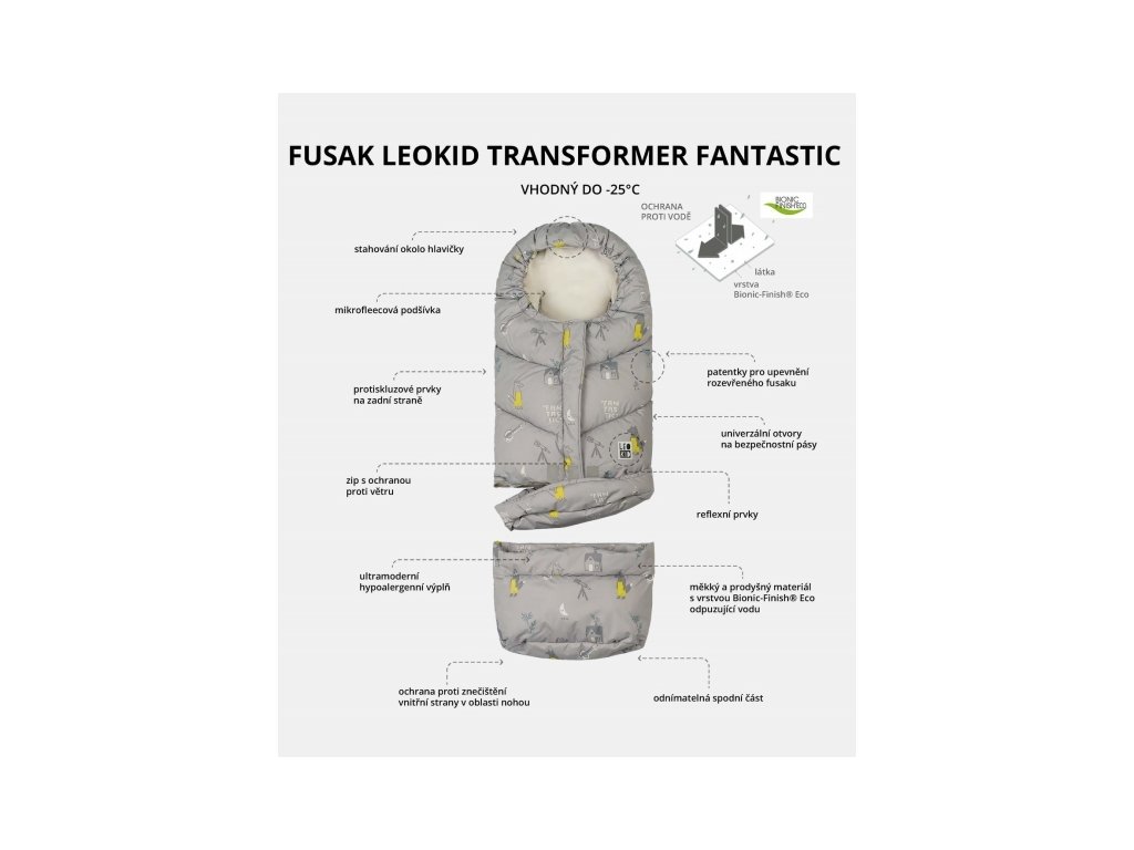 Fusak Transformer určen pro děti od 0 do 3–4 let odepínací spodní část reflexní prvky ochranný materiál proti nečistotám ve spodní části lze ve spodní části odepnout a přizpůsobit tak například autosedačce nebo hluboké korbičce Vlastnosti stahování v oblasti hlavy měkká a prodyšná tkanina s vodoodpudivou vrstvou Bionic-Finish® Eco protiskluzová aplikace na zadní straně fusaku patentky k zafixování horní části fusaku ultramoderní hypoalergenní výplň reflexní prvky zip s ochranou proti větru univerzální systém zipu odnímatelná spodní část ochranný materiál proti nečistotám ve spodní části membrána na 3 000 mm vodní sloupec ekologická impregnace BIONIC-FINISH®ECO vhodný do -25°C Technické parametry rozměry: 90 x 50 cm / 110 x 50 cm materiál: 100% polyester, microfleece, syntetické peří vhodný do -25 ° C