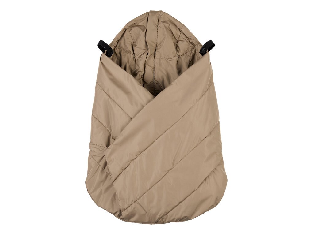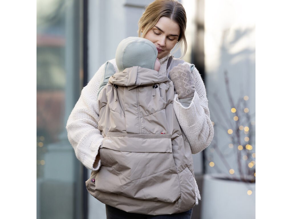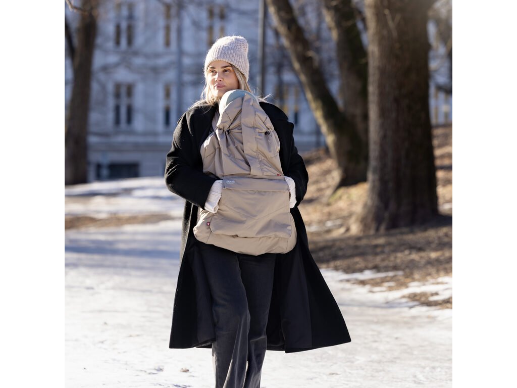 Poťah sa jednoducho pripája na akýkoľvek nosič pomocou patentných gombíkov. Zips v hornej časti umožňuje vetranie alebo rýchly prístup k dieťaťu. Kapucňu možno nastaviť tak, aby tesne priliehala k hlave dieťaťa, a vnútorné elastické šnúrky v oblasti nôh vám umožnia nastaviť ho podľa dĺžky vášho dieťaťa. Vrecká na ruky vám poskytujú priamy kontakt s dieťaťom alebo slúžia aj ako ohrev rúk. Keď sa kryt nepoužíva, dá sa zložiť do skladacieho vrecka na zips. Počas používania ponúka to isté vrecko pohodlné uloženie drobných osobných vecí. Kryt je určený na nosenie vnútri aj vonku a je perfektným praktickým pomocníkom aj v kočíku alebo pri dojčení vonku.