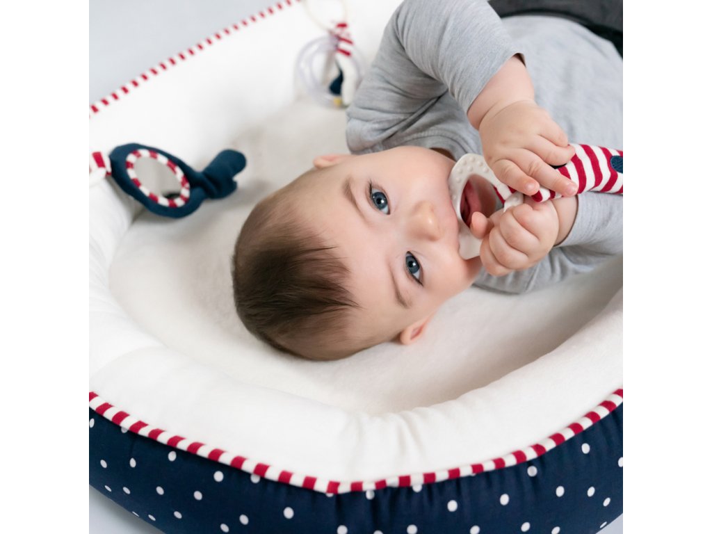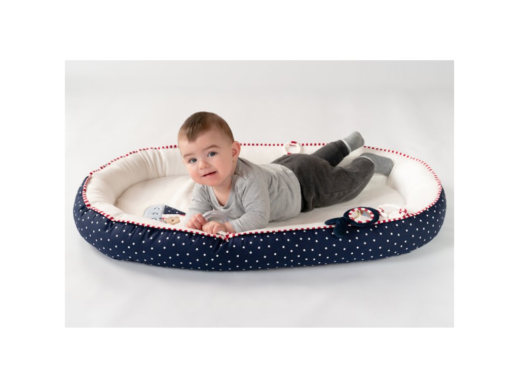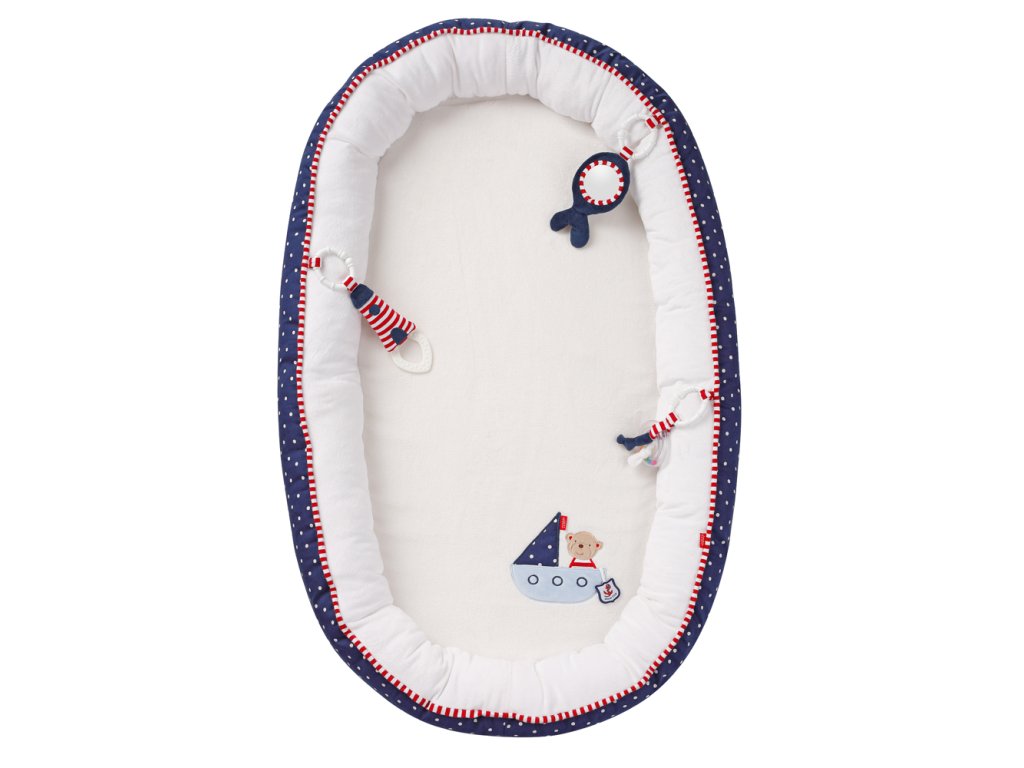 Plyšové hniezdočko z kolekcie Ocean Club s povrchom na ležanie vyrobeným z extra mäkkých materiálov priamo nabáda k maznaniu, spánku a hre. Vďaka obzvlášť mäkkému a polstrovanému okraju je v ňom dieťatko rozmaznávané pohodlím navodzujúcim pocit ochrany a bezpečia. Pritom na dosah ruky má tri odnímateľné hračky podporujúce zvedavosť dieťaťa a starajúce sa o jeho zábavu pri hraní. Ich súčasťou je hrkálka, zvrásnený papier a zrkadlo, ktoré prispievajú k tréningu motoriky. Mäkké hryzátko potom pomáha vo fáze hryzenia.