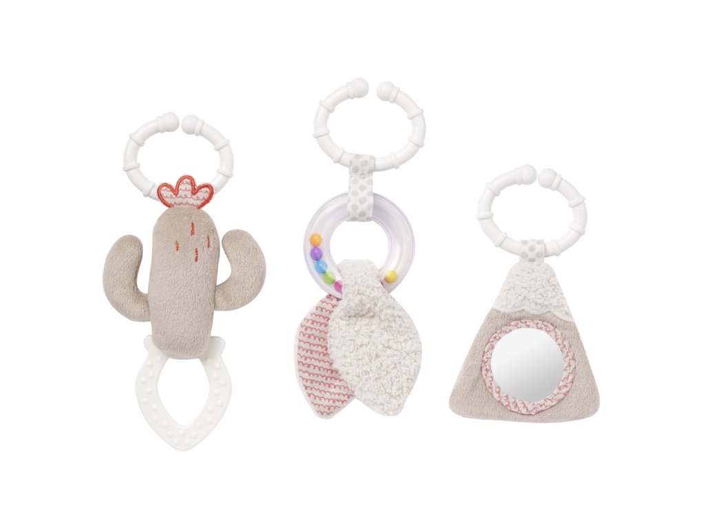 Tri prívesky s morskými zvieratkami zvyšujú pozornosť dieťaťa a poskytujú mu zábavu. Pískatko, hrkálka, šuštiaci papier a zrkadlo podporujú motorické zručnosti dieťaťa od narodenia.