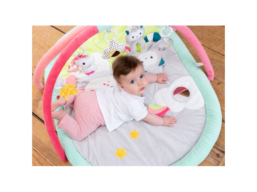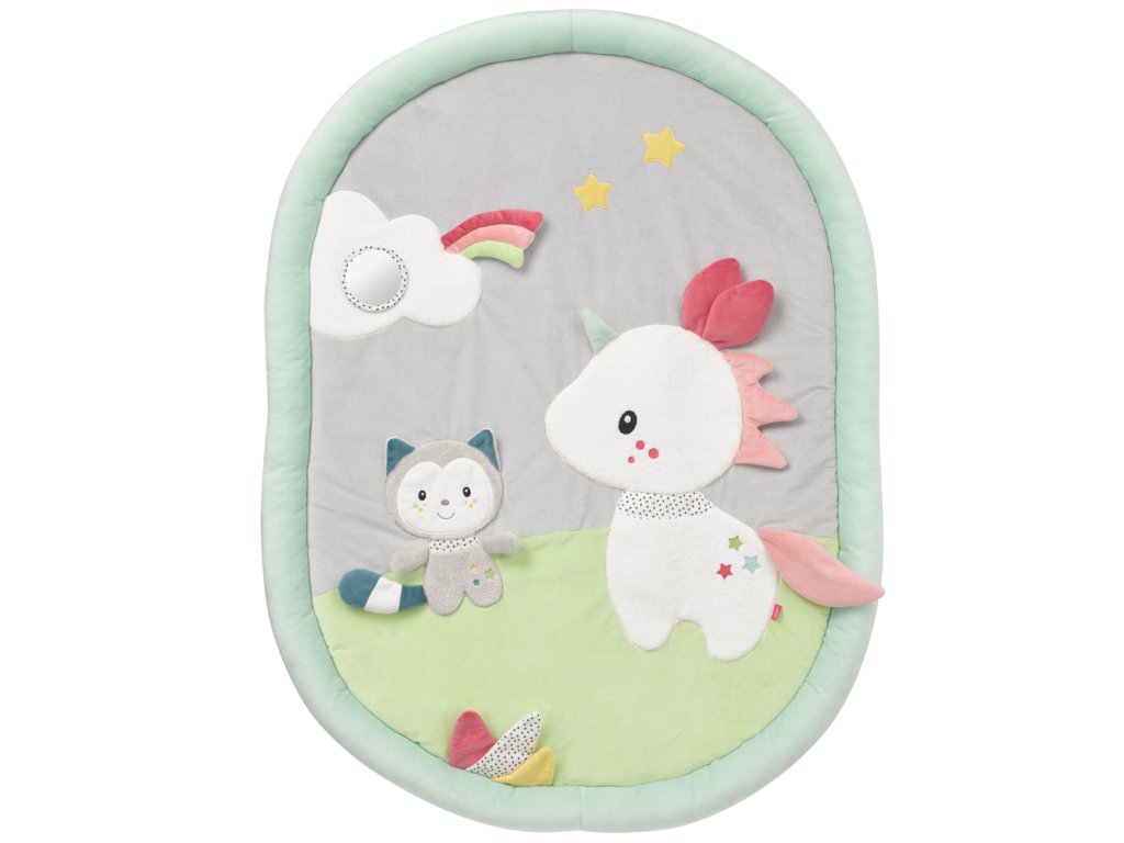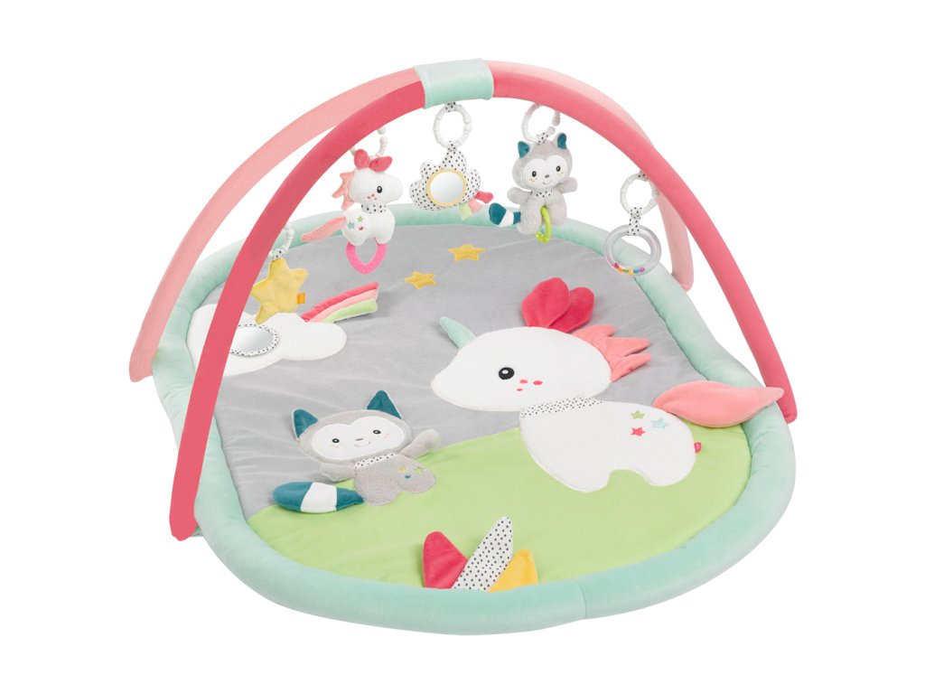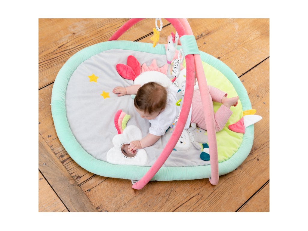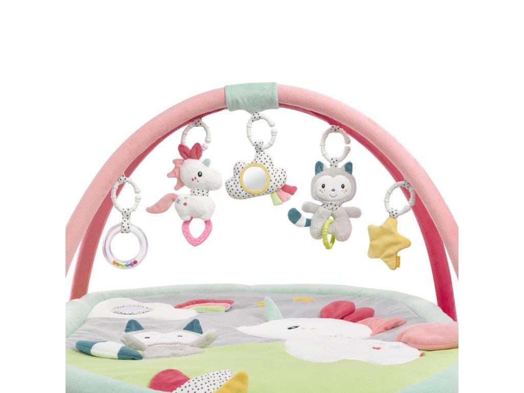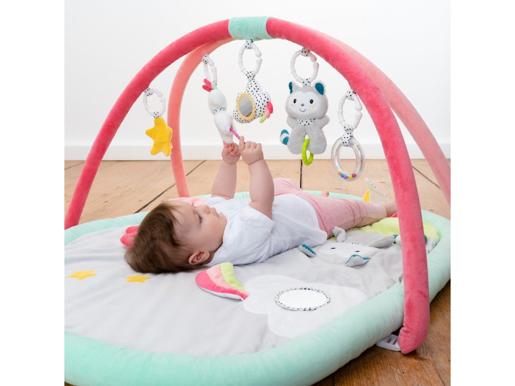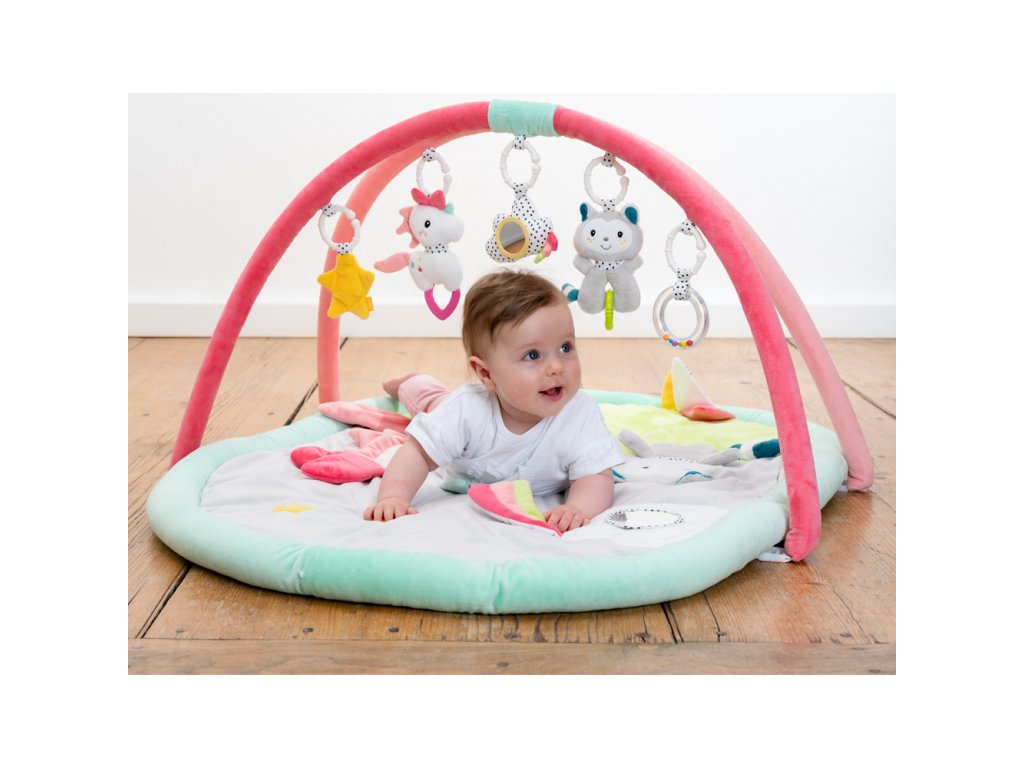 Mäkká prešívaná deka Aiko & Yuki pozýva dieťa k dotyku, maznaniu a hraniu na ležiacej ploche s rozmanitými materiálovými štruktúrami a povrchy. Trojrozmerné postavičky visiace na hracom oblúku napomáhajú cielenému uchopeniu a koordinácii ruka-oko. Dieťa tu zaujme pískací jednorožec a v ňom skrytý škrečok, hrkajúca mačka, hrkálkový mrak a šuštiaca hviezda. Veselé zvieratká tak podporujú zábavu pri hraní, zvyšujú pozornosť dieťaťa a cibrí jeho zmysly i motoriku.
