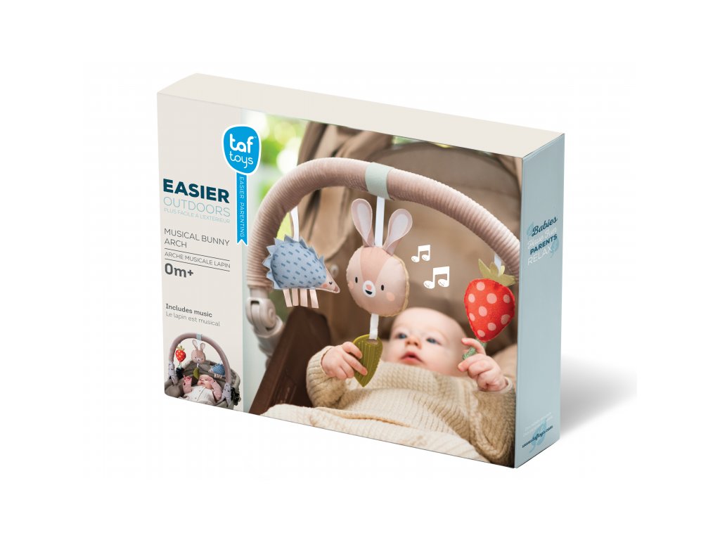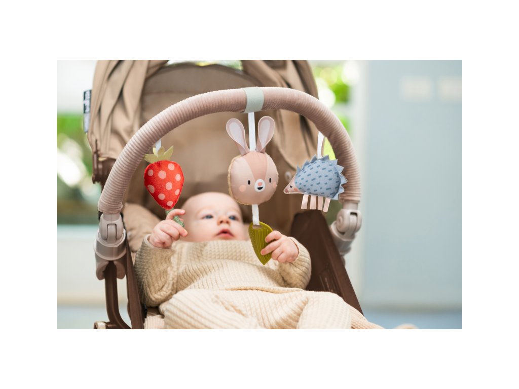 Hudobná hrazda určená na pripevnenie na kočík alebo autosedačku zabaví vaše bábätko na cestách. Ľahko ju s pomocou flexibilných plastových klipsov pripevníte k väčšine kočíkov aj autosedačiek. Pozornosť dieťaťa upúta králiček, ktorý po ľahkom dotyku hrá melódiu, hrkajúci ježko aj cinkajúca jahôdka.