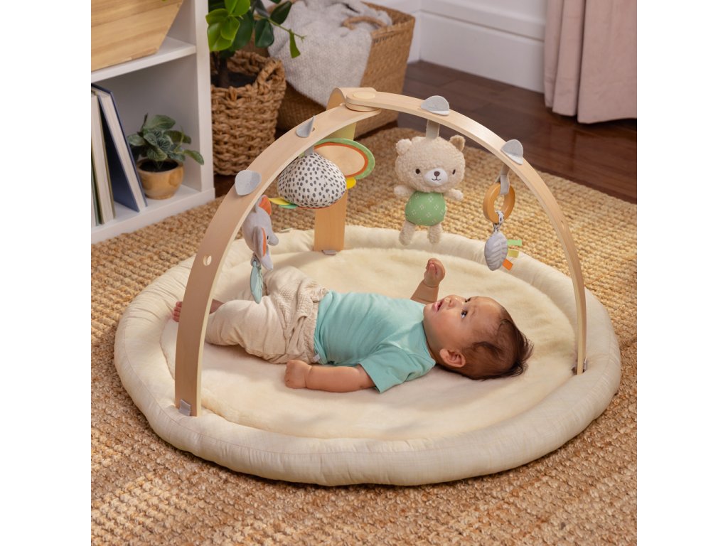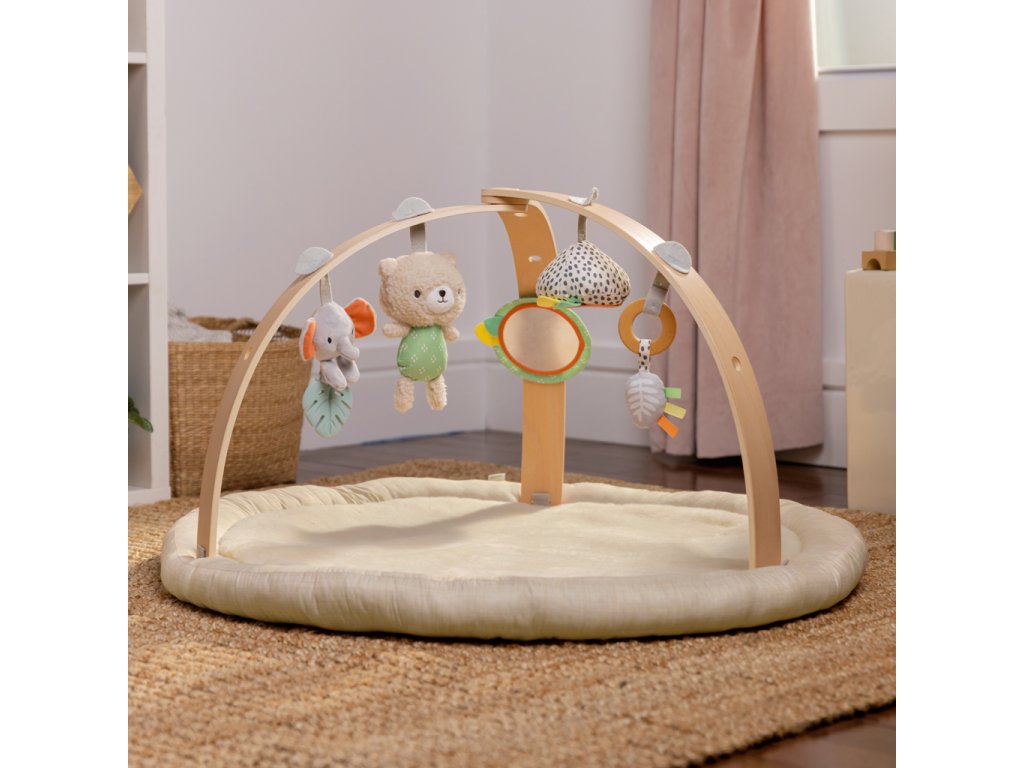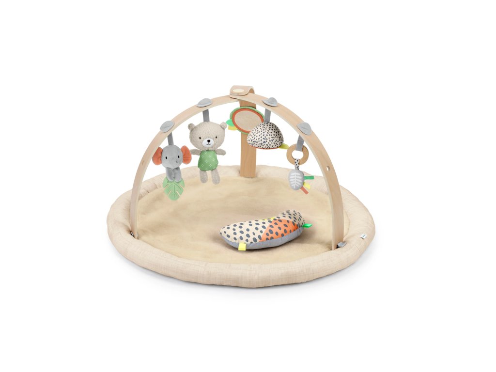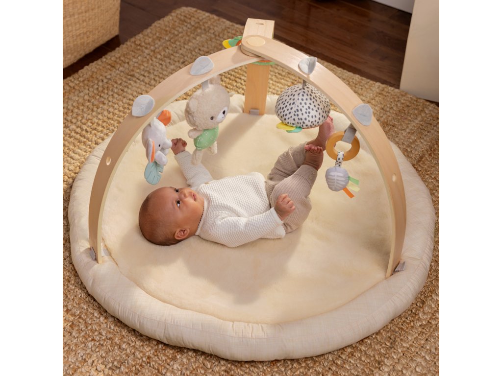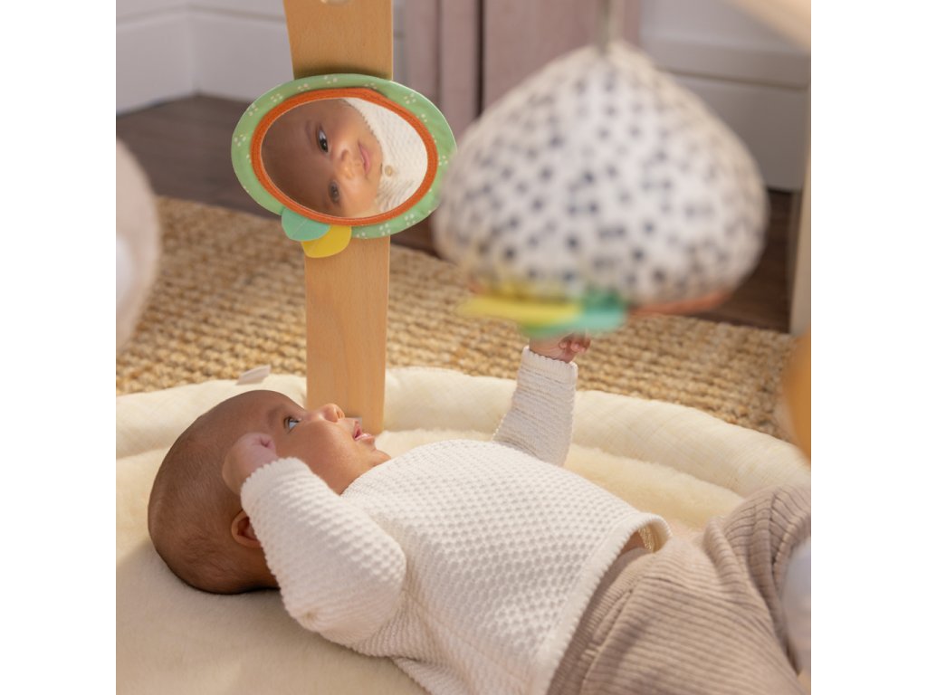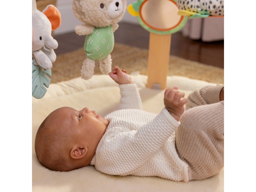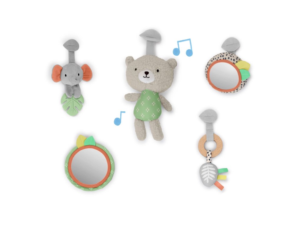 Drevená odnímateľná hrazdička obsahuje 5 rôznych hračiek, ktoré ponúkajú dieťatku plno zábavy. Dokonca si ich ľahko môžu zobrať kamkoľvek so sebou. Dve plyšové hračky macko a sloník, drevený krúžok so senzorickou stužkou a dve zrkadlové hračky podporujúce seba-objavovanie dieťatka.
