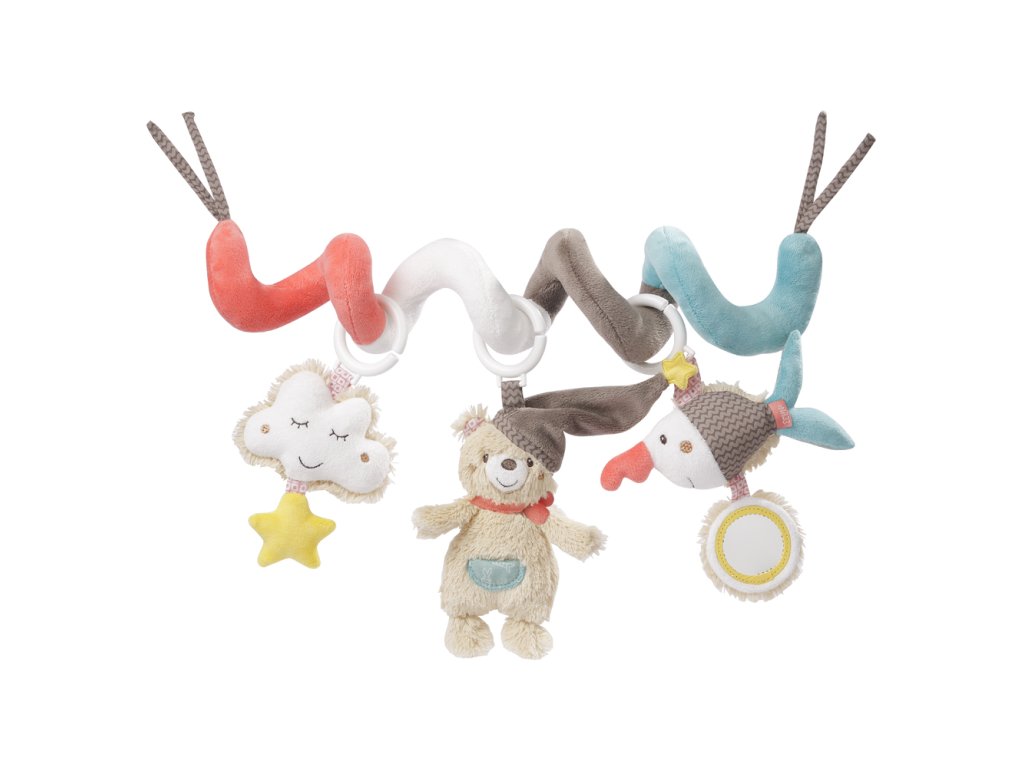 Farebná, plyšová špirála je príjemná na dotyk a vďaka zaveseným hračkám nabáda deti k objavovaniu nových podnetov. Stimuluje ich zmysly a poskytuje im zábavu. Na špirále sú tri veselé prívesky v tvare mraku, medvedíka a rybičky. Hračky na špirále sú pohyblivé vďaka krúžkom a možno ich individuálne meniť.